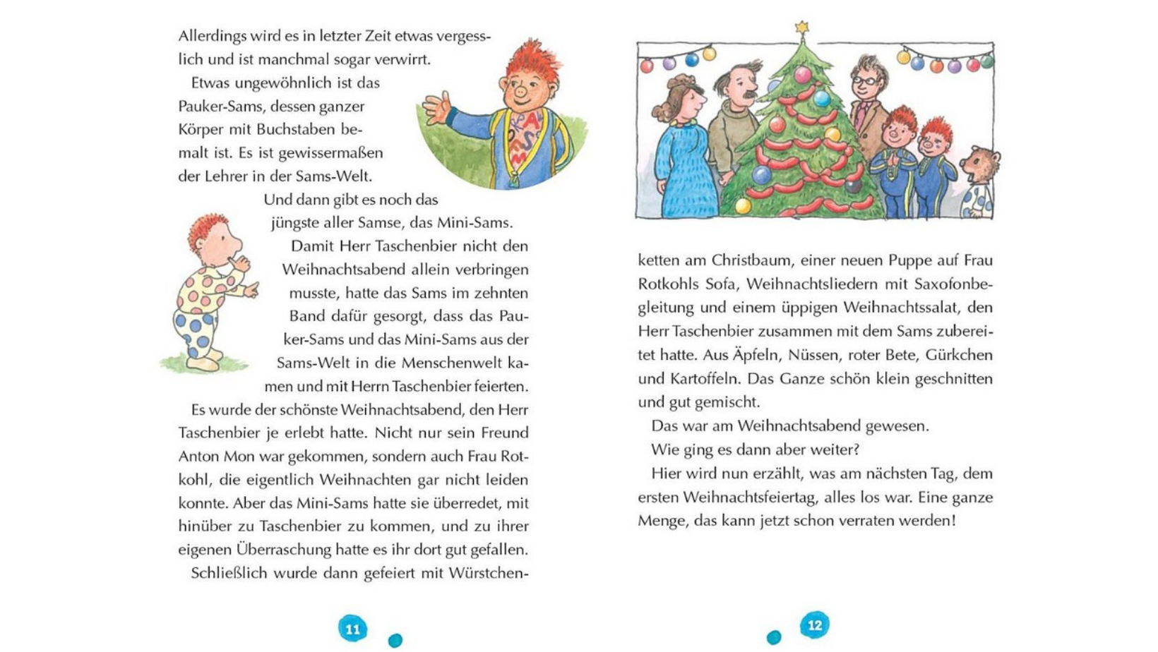 Damit Herr Taschenbier den Weihnachtsabend nicht allein verbringen muss, hat das Sams das Pauker-Sams und das Mini-Sams aus der Sams-Welt in die Menschenwelt eingeladen. Eines der schönsten Weihnachtsfeste, die Herr Taschenbier je erlebt hat. Zu dem auch sein Freund Herr Mon und Frau Rotkohl gekommen sind. Am ersten Weihnachtsfeiertag sitzen Herr Taschenbier und das Sams bei einem späten Weihnachtsfrühstück zusammen und lassen gemeinsam den Heiligabend Revue passieren. Dazu gesellt sich auch Frau Rotkohl.