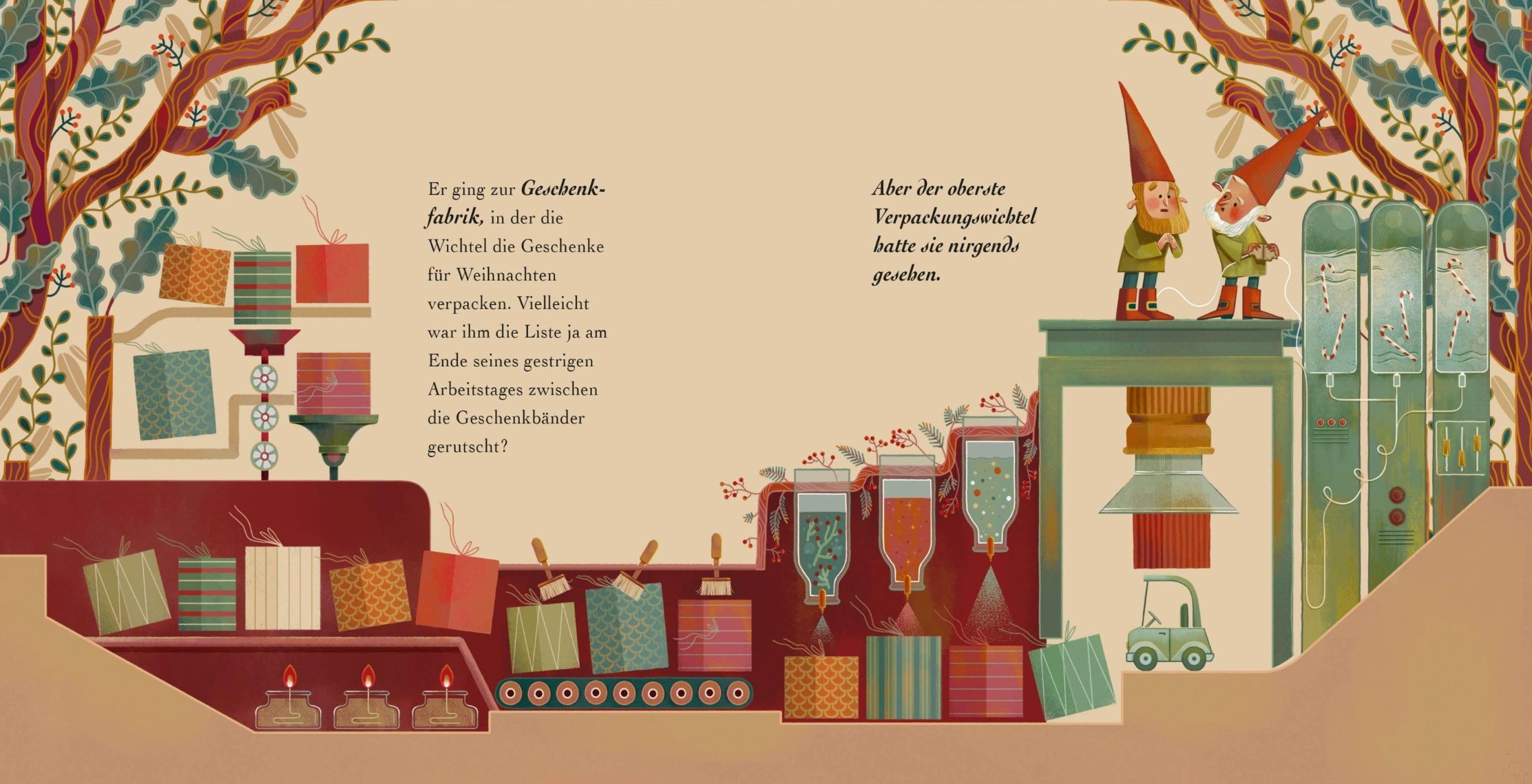 Vielleicht ist ihm ja die Liste gestern zwischen die Geschenkbänder gerutscht? Eilig läuft der Wichtel zur Geschenkfabrik. Aber dort ist sie nirgends zu sehen. Im Postraum ist sie auch nicht zu finden. In der Küche gibt es zwar warme Plätzchen aus dem Ofen, aber keine Liste. Und der Heiligabend rückt immer näher. Was soll jetzt nur geschehen? Wird sein Missgeschick das Weihnachtsfest überall auf der Welt ausfallen lassen? Der Weihnachtself macht sich auf den Weg zum Weihnachtsmann…
