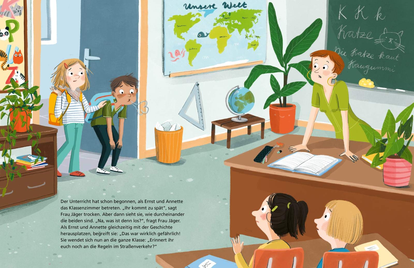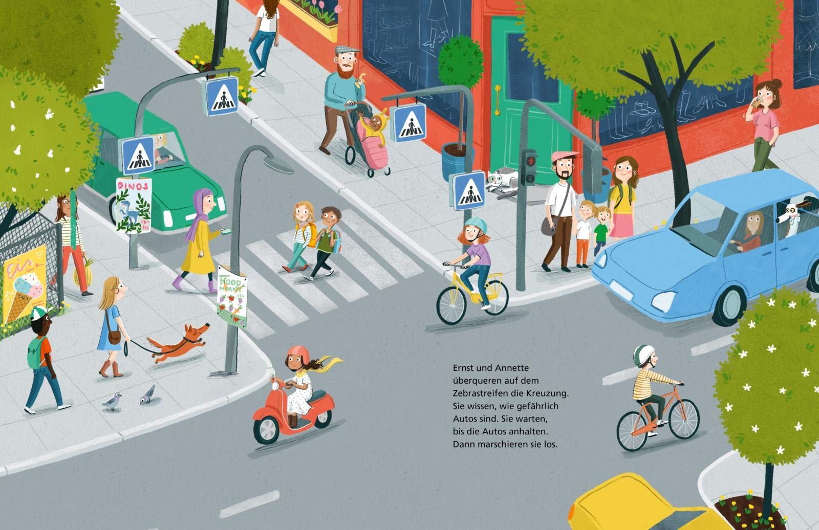 Annette und Ernst gehen zusammen in die 1. Klasse. Morgens um halb acht holt Annette Ernst vor seinem Haus ab. Auf ihrem Weg müssen sie eine große Straße und eine Kreuzung überqueren. Beide wissen, dass es im Straßenverkehr Gefahren gibt. Deswegen bleiben sie an der roten Ampel stehen und gehen bei grün über die Straße. Auf der Kreuzung gibt es einen Zebrastreifen. Hier warten sie, bis die Autos anhalten und marschieren dann los.