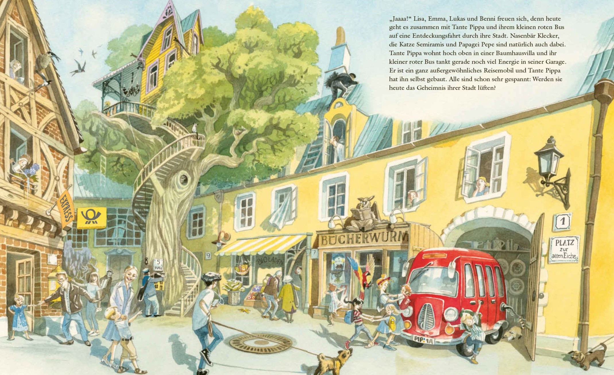 Lisa, Emma, Lukas und Benni sind so aufgeregt. Für sie geht es zusammen mit Tante Pippa und ihrem kleinen roten Bus auf Entdeckungsfahrt durch ihre Stadt. Nasenbär Klecker, Katze Semiramis und Papagei Pepe sind mit dabei. Los geht es am Platz zur alten Eiche, wo Tante Pippas Baumhausvilla steht. Der kleine rote Bus tankt noch Energie in der Garage. Es ist ein ganz außergewöhnliches Reisemobil, das Tante Pippa selbst gebaut hat. Alle sind schon total gespannt: Was sie wohl alles entdecken werden?
