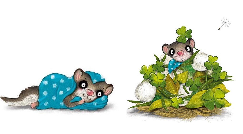 Immer noch nicht ganz perfekt. Der kleine Siebenschläfer holt noch Klee, einen Berg Pusteblumen und Moos und Wolle und Federn. Uff. Irgendwie ein bisschen zu viel. Das ist ganz und gar nicht kuschelig-wuschelig und gemütlich. So wird das mit dem Einschlafen nichts. Und nun? Der kleine Siebenschläfer hat noch eine Idee. Er schnappt sich seine Kuscheldecke und…