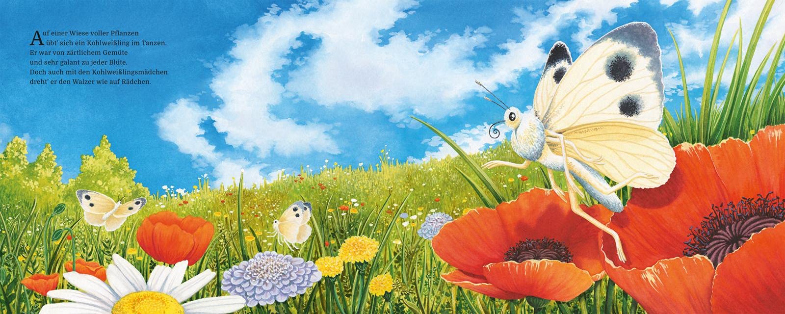 Auf einer Wiese inmitten blühender Blumen wohnt ein Schmetterling. Er ist sehr empfindsam. Vor allem Lärm kann er nicht leiden. So ärgert ihn das Verkehrsgetöse der nahen Straße sehr. Darum sucht er im Wald auf einem Pilz seine Ruhe. Als er sich bei einer Hummel über ihr Gebrummel beschwert, macht sie den Kohlweißling darauf aufmerksam, dass er SCHMETTERLING heißt. Schmetter, wie furchtbar findet der Schmetterling. Darüber wird er ganz traurig und zieht sich zurück…