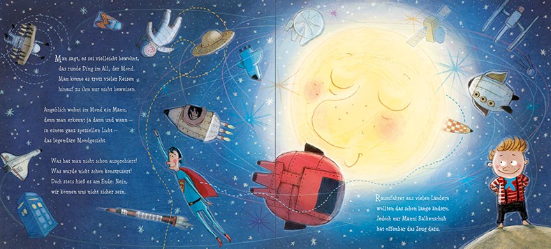 Aber als Manni beim Mond ankommt, ist der gerade nur eine Sichel. Eine Landung mit seiner Rakete ist nicht möglich. So dreht Manni ein paar Runden durch das Universum. Nachdem er die Sterne und Planeten bewundert hat, geht es wieder zurück zum Mond. Und nun ist dieser rund und voll. Schnell landen und ab geht es auf eine Erkundungstour. Nur vom Mann im Mond ist weit und breit nichts zu sehen. Manni ist traurig. Da stupst ihn plötzlich jemand an…