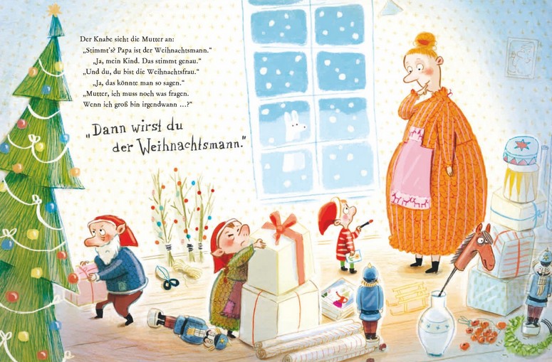 Der hat ganz schön viel um die Ohren. Die Weihnachtswichtel fordern Mindestlohn, dann ist da noch die Schokohohlkörper-Produktion und auch Weihnachtsbäume wollen leben. Kurz und gut. Der Weihnachtsmann zupft sich am Bart. Die alten Gesetze, darf er nicht verletzten: „Was ein Kind sich wünscht vom Weihnachtsmann, muss ich erfüllen, wenn ich`s kann.“. Und der Junge, ganz schön schlau, schreibt seinen Wunsch auf seinen Wunschzettel. Aber wer bringt denn nun die Geschenke am Heiligabend? Na, das macht nun der…