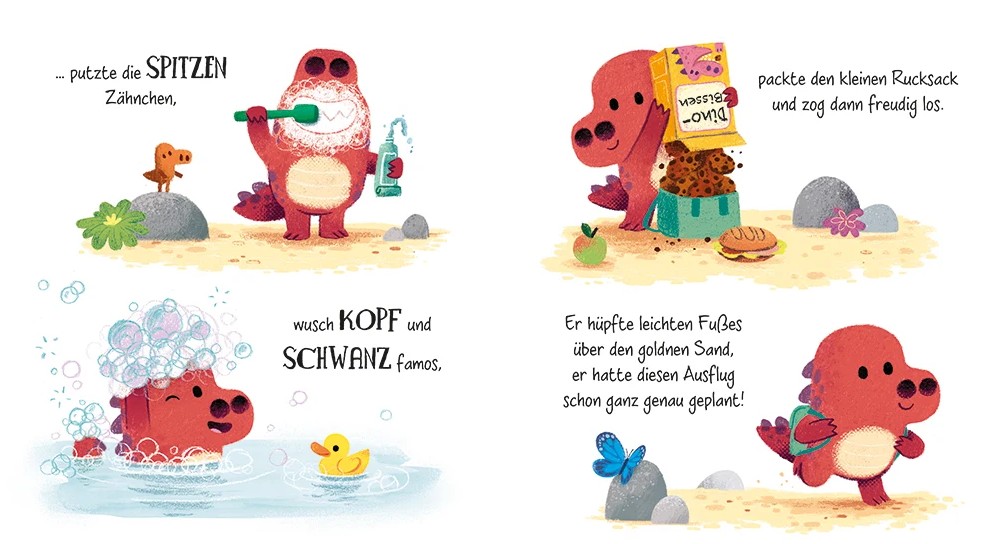 Fröhlich springt der kleine Sorgosaurus aus der Höhle und macht sich für den Tag startklar. Er packt Snacks und wichtige Dinge seinen Rucksack, denn heute möchte er einen fantastischen Ausflug mit einem Picknick machen. Das hat er ganz genau geplant. Er mag es, wenn alles durchdacht und vorbereitet ist. So kann eigentlich nichts schief gehen. Los geht es, das Abenteuer kann beginnen.