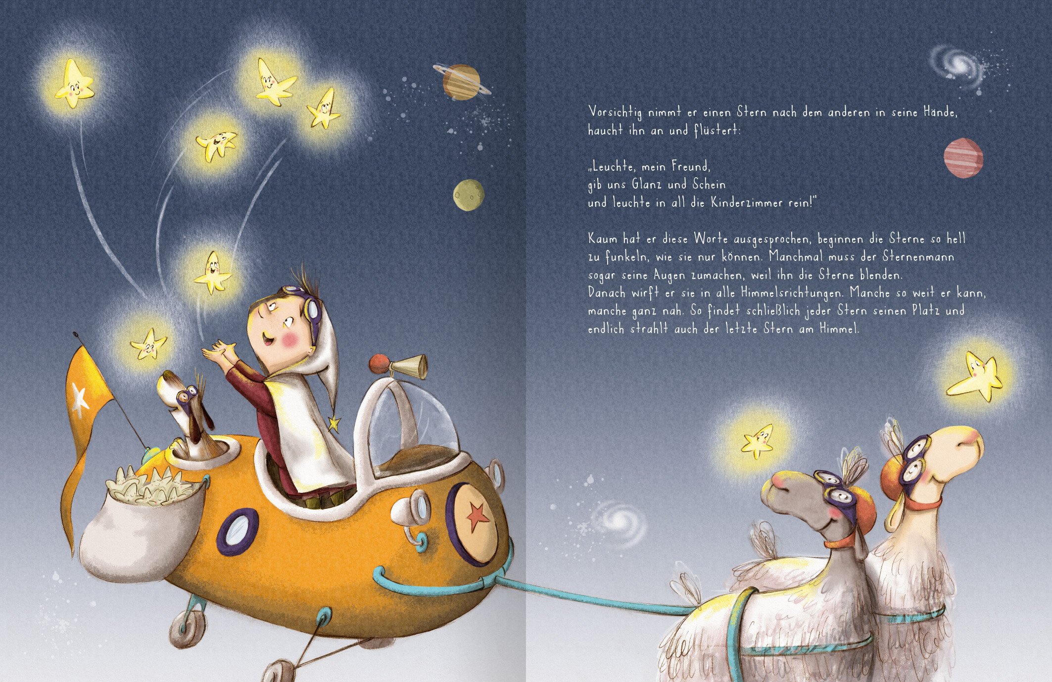 Jeden Abend macht sich der Sternenmann auf in den Abendhimmel und verteilt die Sterne. Vorsichtig nimmt jeden einzelnen in die Hand und flüstert ihm einen kleinen Leuchtezauberspruch zu. Kaum hat er diese Worte ausgesprochen, beginnen die Sterne hell zu funkeln. Danach wirft er sie in alle Himmelsrichtungen. Manche so weit er kann, manche ganz nah. So findet jeder Stern seinen Platz und leuchtet am Himmel. Dann setzt sich der Sternenmann zufrieden in seinen Schaukelstuhl auf der Veranda und schaut ihnen eine Weile zu.