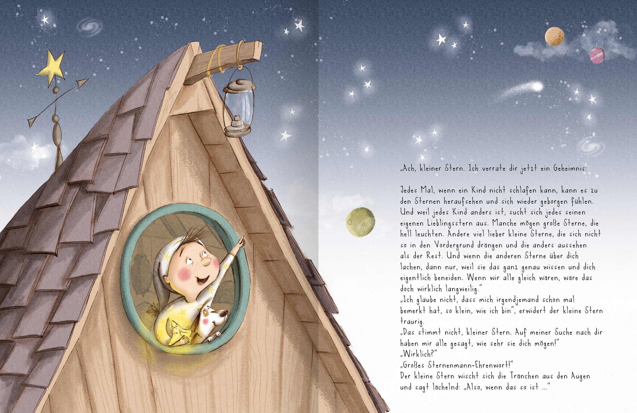 Aber halt! Da fehlt doch einer! Der kleinste Stern von allen ist nirgends zu sehen. Sofort macht sich der Sternenmann auf die Suche. Er fragt beim Sandmann, beim Mondmann und eine Astronautin. Niemand hat den kleinen Stern gesehen. Er ist bis zum Morgen unterwegs. Nur kann ihm auch die Sonne nicht weiterhelfen. Ratlos geht der Sternenmann nach Hause. Da fällt ihm plötzlich unter seinem Bettchen ein Flackern auf. Dort sitzt der kleine Stern und ist traurig, weil er so klein ist und nicht so hell leuchtet, wie die anderen Sterne. Der Sternenmann nimmt den kleinen Stern fest in den Arm und flüstert ihm ein Geheimnis ins Ohr…
