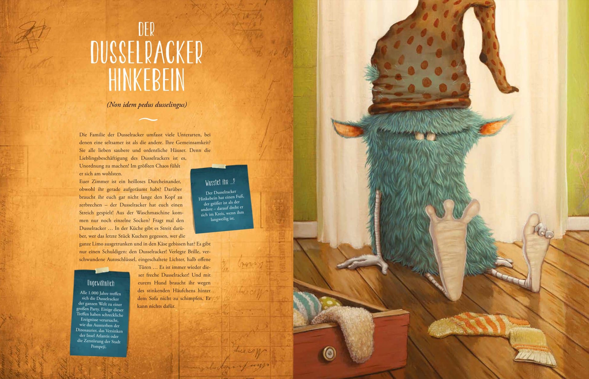 Der Dusselracker Hinkebein hat einen Fuß, der größer ist als der andere – darauf dreht er sich im Kreis, wenn ihm langweilig ist. Er liebt saubere, aufgeräumte und ordentliche Häuser, denn seine Lieblingsbeschäftigung ist es, Unordnung zu machen! Im größten Chaos fühlt er sich am wohlsten. Ein Durcheinander im Zimmer, verlegte Brille, verschwundene Autoschlüssel oder eingeschaltetes Licht – der Dusselracker hat euch einen Streich gespielt!