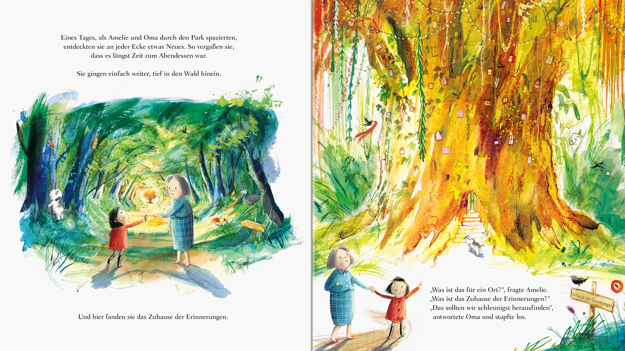 Amelie ist manchmal vergesslich wie Oma. Vor allem, wenn sie ihre Umgebung erkundet und sich in Fantasiewelten träumt. Aber Oma vergisst immer mehr: wertvolle Dinge, schöne Erinnerungen und zauberhafte Momente. Wie gut, dass die beiden bei einem ihrer Spaziergänge das Zuhause der Erinnerungen entdecken. Einen ganz magischen Ort. Und auch wenn die Erinnerungen von Zeit zu Zeit in die Räume dort verschwinden, die Gefühle zueinander bleiben: „Dich vergesse ich nie“…