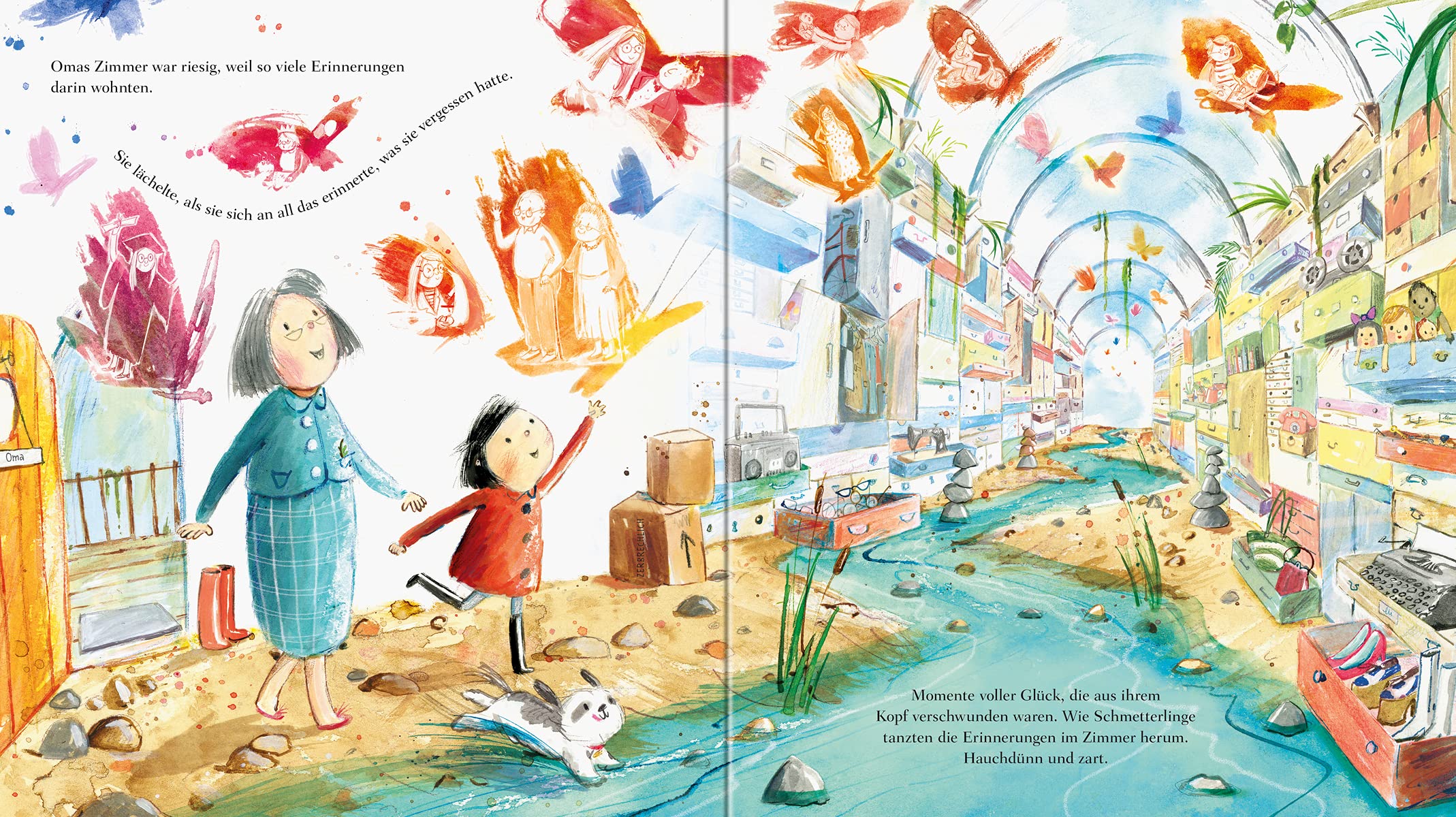 Amelie schlägt vor, dass sie Omas Erinnerungen suchen. Mit einem Ballon heben sie ab und steigen hoch in die Lüfte. Bis sie zu einer Tür kommen, an der Omas Name steht. Omas Zimmer ist riesig und voll bis oben hin. Dort wohnen so viele Erinnerungen. Momente voller Glück, die wie Schmetterlinge im Zimmer herumtanzen. Vorsichtig picken sie Erinnerungen heraus. Diese hält Amelie in einem von ihr selbstgestalteten Erinnerungsbuch fest. Und jeder Moment, den Oma eingesammelt hat, kommt hinein…