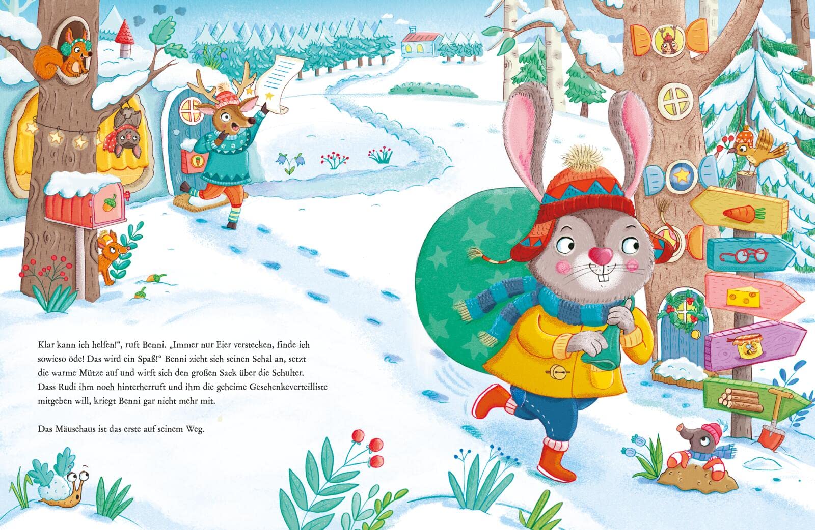 Es ist Heiligabend und Hase Benni hockt in seinem wohlig warmen Bau. Er kramt in einem Karton mit Weihnachtsschmuck, als Rentier Rudi an der Tür klopft. Rudi ist verzweifelt: der Weihnachtsmann ist krank. Um die Geschenke noch rechtzeitig zu verteilen, springt Benni ein. Blitzschnell hoppelt er los. Das ihm Rudi noch die geheime Geschenkeverteilerliste mitgeben will, bekommt Benni gar nicht mehr mit. Benni hopst zum Mäusehaus, zum Biber, zur Eule und zur Bärin.