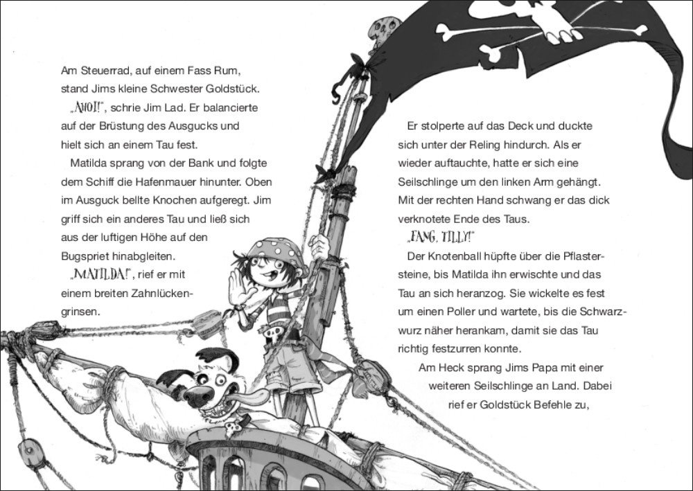 „Die Jolley-Rogers – Im Bann der Geisterpiraten“* von Jonny Duddle beeindruckt mit ausgefallenen Illustrationen im Comic-Stil. Diese sind detailverliebt, zugespitzt und spielen auf ziemlich lustige Weise mit einigen Klischees. Das Buch eignet sich aber auch für Kinder ab 8 Jahren wunderbar zum Selbstlesen. Der Text ist überschaubar und dank der großen Schrift gut zu lesen. Das abwechslungs- und spannungsreiche Abenteuer wird mit den ausdrucksstarken Illustrationen optisch passend untermalt. Die im Buch verwendeten typischen Begriffe der Piratensprache werden am Ende des Buches in einem kleinen Lexikon noch einmal ausführlich erklärt. Das Abenteuer von Mathilda und den Jolley-Rogers bietet für Jungs und Mädchen einen starken Spannungsbogen in einer liebevoll erzählten Geschichte. Ein Buch mit einer außergewöhnlichen Erzählweise – aber ein echtes Original…