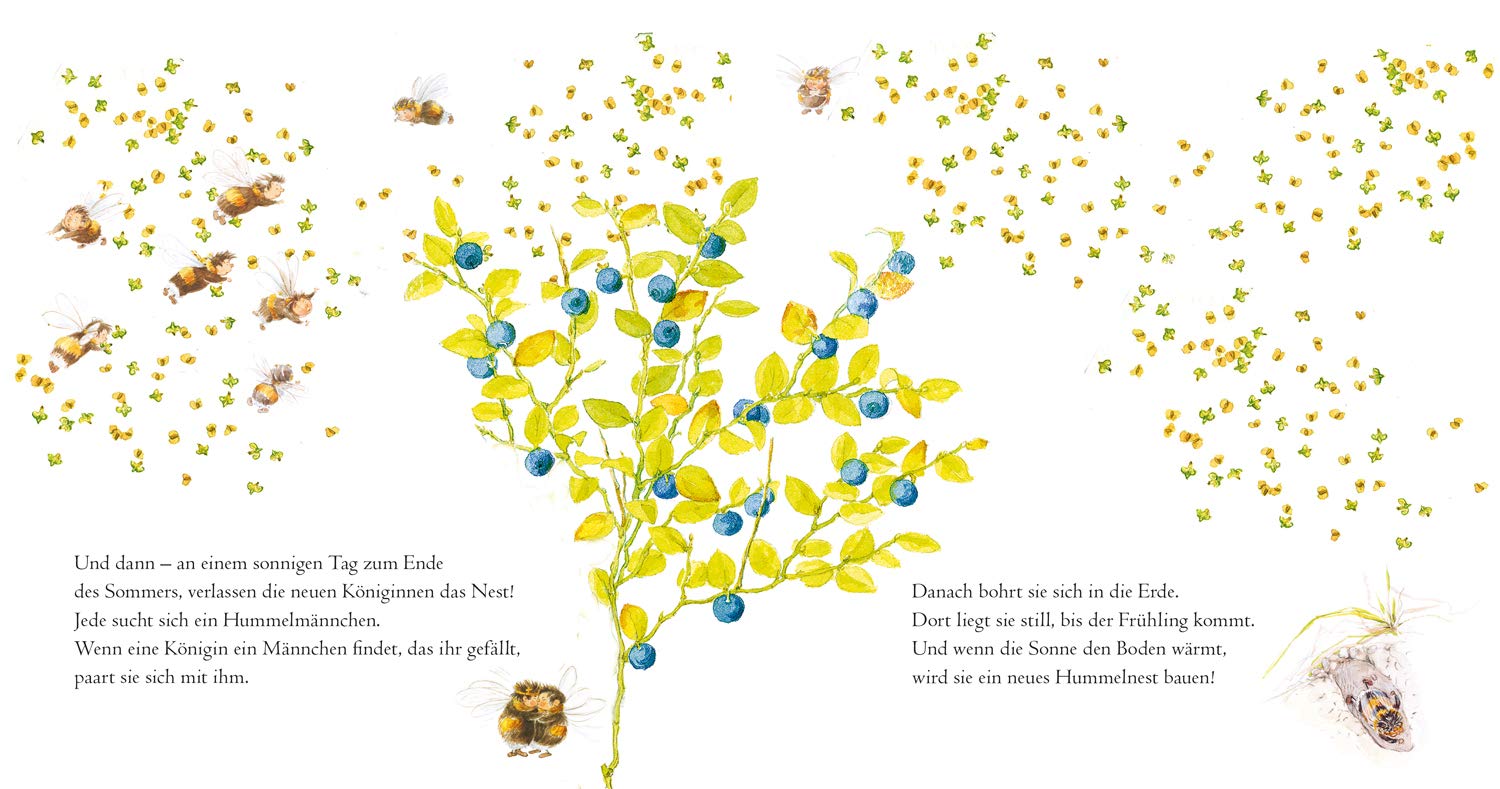 Den ganzen Winter lang liegt die kleine Hummelkönigin still in der Erde. Als der Frühling Einzug hält, wecken die warmen Sonnenstrahlen sie auf. Aber Zeit diese in Ruhe zu genießen, hat sie keine. Sie muss flugs einen schönen Platz für ihr Sommernest finden. Am liebsten ist ihr ein leeres Loch in der Erde. Hat sie einen Nistplatz gefunden, baut die Hummelkönigin kleine Töpfe aus Wachs.
