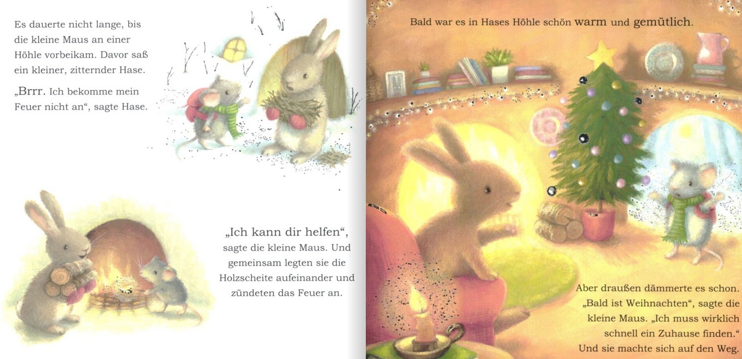 Die kleine Maus unterstützt sie beim Kuchenbacken und beim Aufhängen der Weihnachtsdekoration. Es ist ganz schön spät geworden, und die kleine Maus muss wirklich noch ein Zuhause für sich finden. Und tatsächlich in einem gekrümmten Baum findet sie eine kleine Höhle. Etwas muffig, aber leer. Schnell läuft sie los, um Blätter für ihr Bett zu suchen. Unterwegs trifft sie den Hasen mit Feuerholz, den Fuchs mit einem Korb und den Bären mit einem Karton. Doch keiner beachtet die Maus. Traurig geht sie zu ihrer Höhle. Aber als sie dort ankommt…