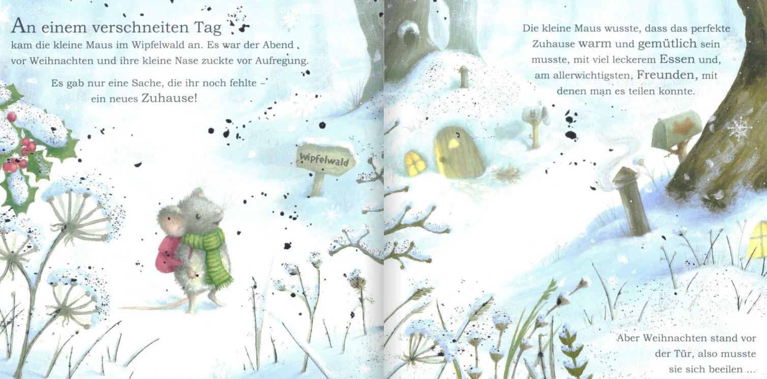 Am Abend vor dem Heiligabend kommt die kleine Maus im Wipfelwald an. Ihre Nase zuckt vor Aufregung. Es ist so schön hier. Jetzt fehlt ihr nur noch ein neues Zuhause. Es soll warm und gemütlich sein, mit viel leckerem Essen und am allerwichtigsten, Freunden, mit denen man alles teilen kann. Die kleine Maus hüpft in den Wald hinein. Da kommt sie an einer Höhle vorbei, vor der ein zitternder Hase sitzt. Er bekommt das Feuer nicht an. Die Maus hilft ihm und macht sich weiter auf den Weg. Aber auch der Fuchs und der Bär brauchen Hilfe.