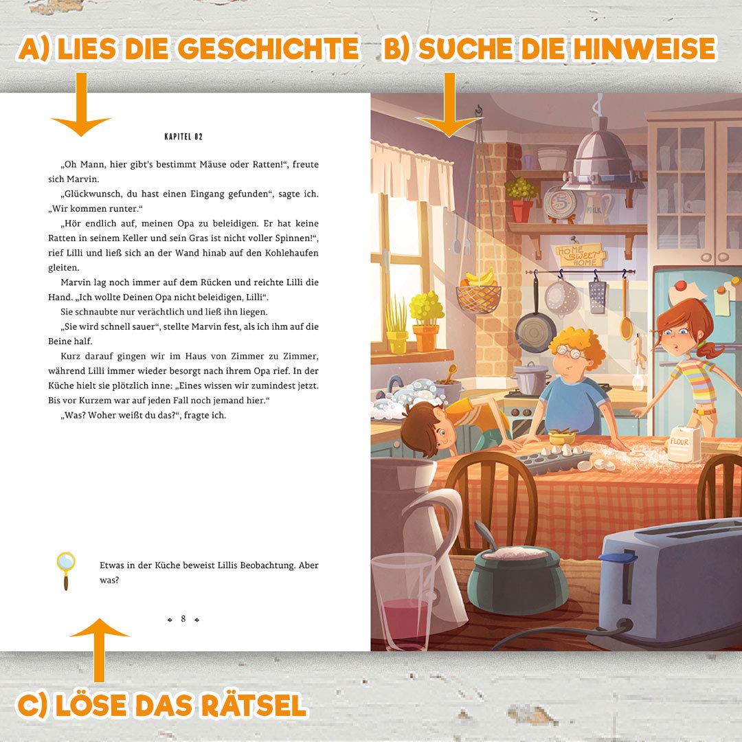 Hierbei müssen beispielsweise Informationen aus dem Text mit Details auf den Bildern kombiniert werden. Manchmal hilft eine Lupe, ein Lineal, ein Stift, ein Zirkel oder ein Spiegel weiter. Zusätzlich ist ein Bonusrätsel versteckt, das sich über alle Illustrationen – im Graphic-Novel-Stil von Cindy Fröhlich – erstreckt und noch eine besondere Überraschung bereithält. Durchdacht von Seite zu Seite. Das Resultat ist eine gelungene Mischung aus Spannung und Unterhaltung. Vor allem für gemeinsame (Vor-) Lesestunden zu empfehlen.
