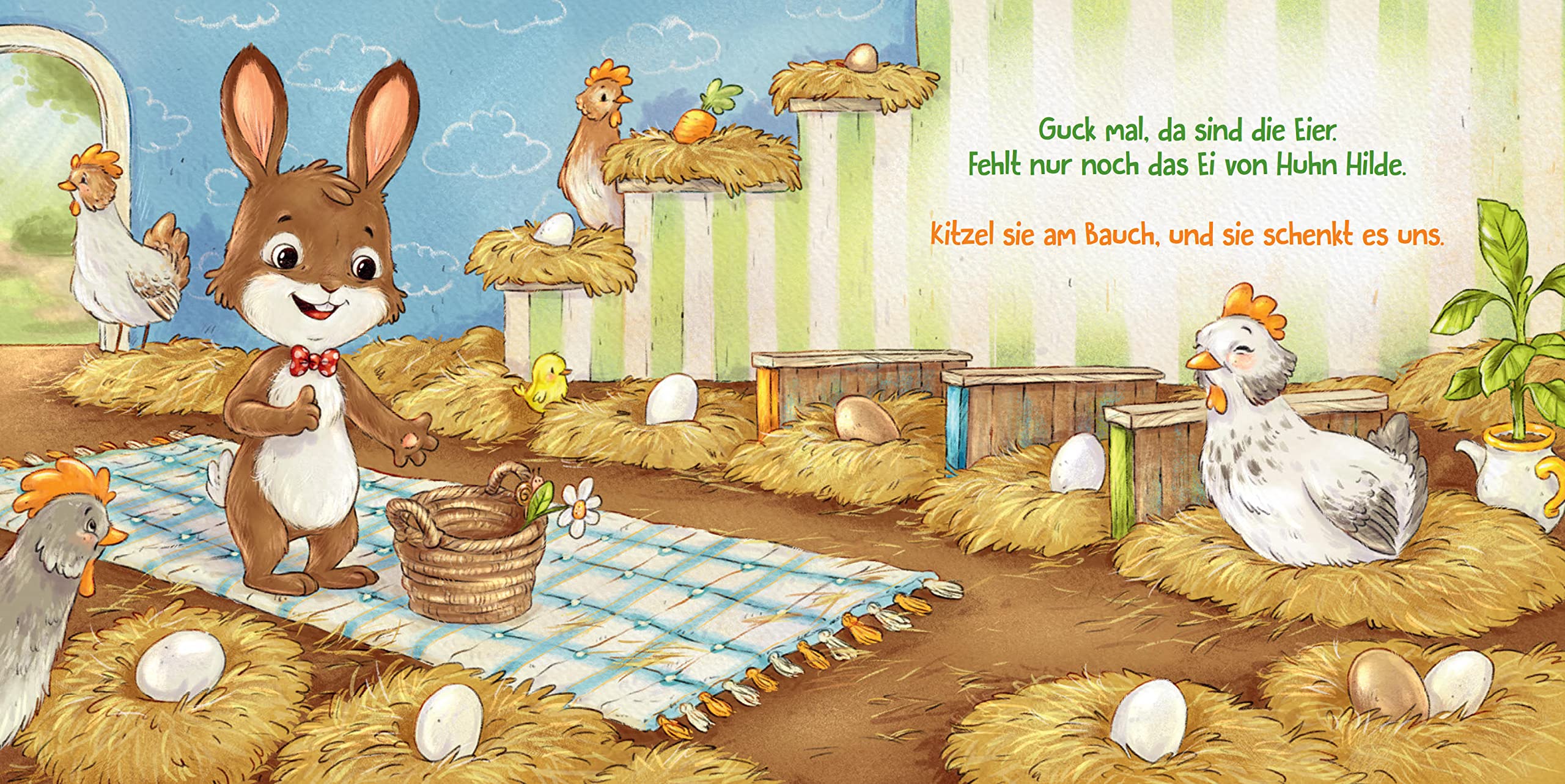 Früh am Morgen streckt und reckt sich das kleine Osterhäschen. Was für ein aufregender Tag: Zum allerersten Mal darf es für das Osterfest die Ostereier bemalen und verstecken. Doch bis dahin wartet eine Menge Arbeit. Los geht es! Auf zum Hühnerstall. Die Hühner sind so fleißig und haben viele Eier gelegt. Die müssen nun eingesammelt werden. Stück für Stück landen sie im Körbchen.