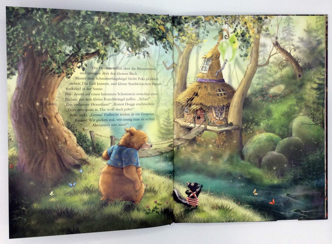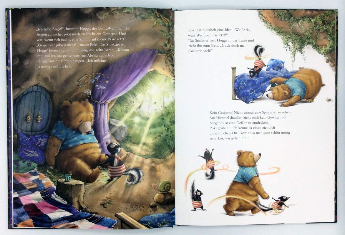 Stinktier Poki besucht seinen besten Freund Hoggs in seiner Bärenhöhle. Aber was ist das. Hoggs lässt die Ohren hängen. Der Bär brummt, dass er Angst hat. Angst davor, dass ihn ein Gespenst piekst oder sich nachts eine Spinne auf seine Nase setzt. Er möchte einfach mutiger sein. Poki grübelt. Und plötzlich fällt ihm etwas ein. Er fasst Hoggs bei der Tatze und zieht ihn mit sich. Zusammen laufen sie über die Bienenweise, springen über den kleinen Bach und halten hinter dem Schmetterlingshügel an. Dort steht das verlassene Hexenhaus. Perfekt, um ein Abenteuer, das viel Mut braucht, zu erleben.