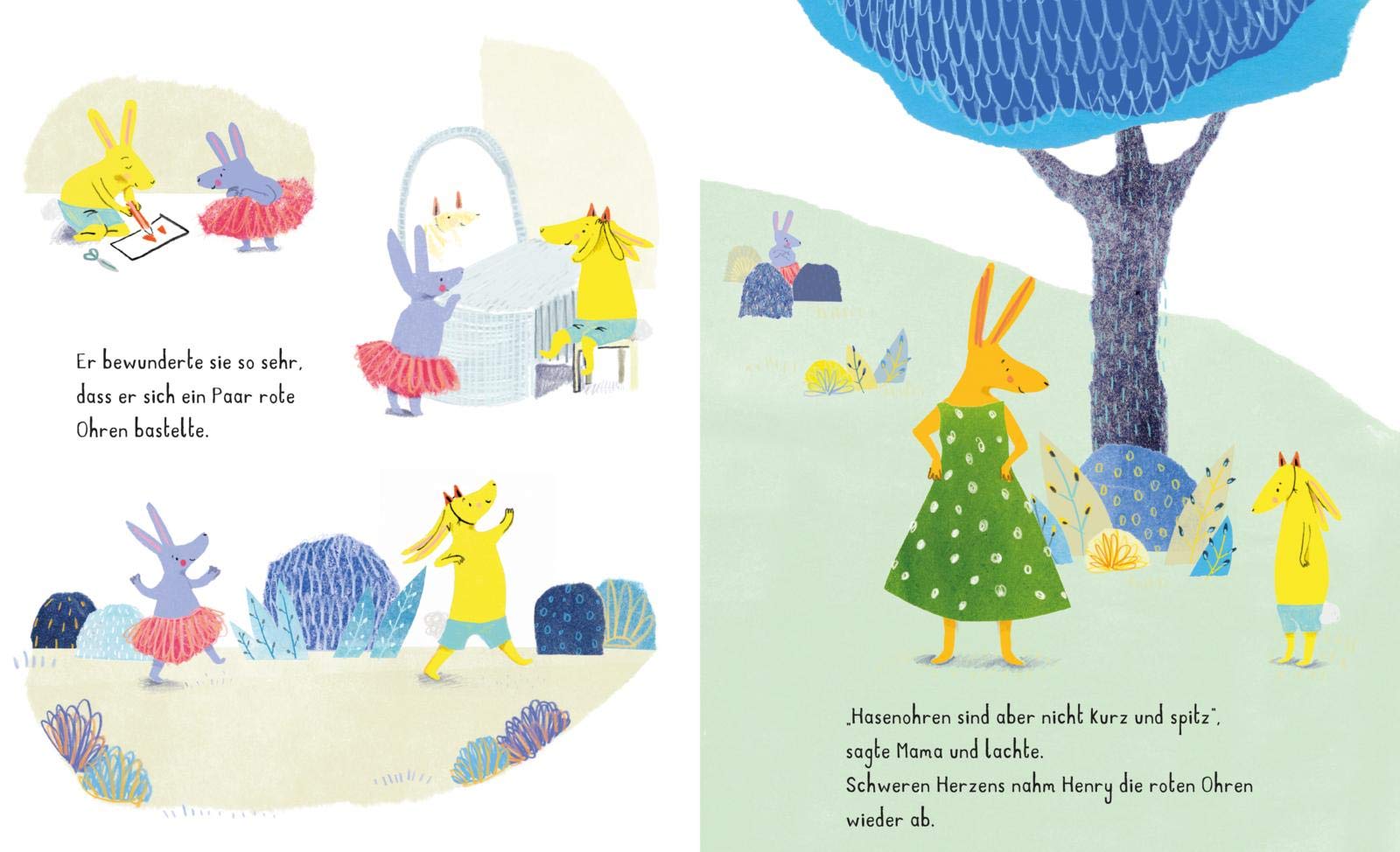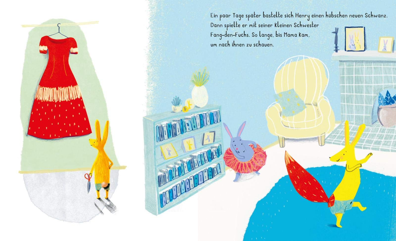 Ein paar Tage später entdeckt Henry Mamas rotes Kleid. Daraus schneidet er sich einen hübschen Fuchsschwanz. Mama ist wütend. Henry soll sich wie ein richtiger Hase verhalten. Das Fell rot anmalen, sich Fuchsohren und einen Fuchsschwanz basteln, gehören nicht dazu. Henry sagt nichts. Doch wenn er draußen spielt, macht er heimlich alles, was er eigentlich nicht tun soll. Er will eben gar kein richtiger Hase sein. Bis Mama ihn im Park beim Spielen mit den Füchsen entdeckt…