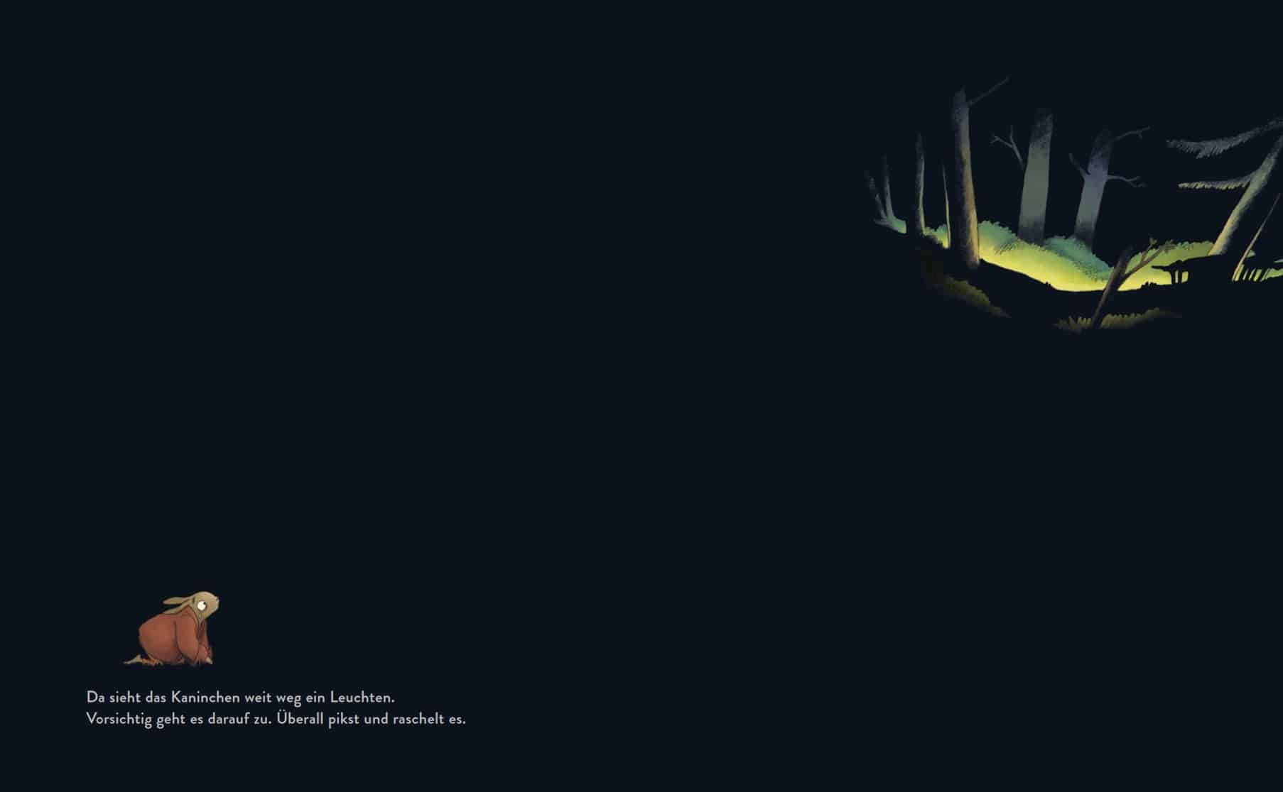 Den ganzen Tag lang ist Kaninchen unterwegs. Überall gibt es etwas zu entdecken: seltsame Steine, Kräuter, eine Hummel, bunte Blumen und ein Apfel im Gras. Immer weiter läuft es in den Wald hinein. Plötzlich ist der Weg verschwunden. Kaninchen kann kaum noch sehen, wohin es tritt. Die Sonne hat das Licht mitgenommen. Und Kaninchen steckt fest. Mitten im Wald. Mitten in der Nacht. Da sieht es ein Leuchten, weit weg. Vorsichtig geht es darauf zu. Auf einer kleinen Lichtung liegt ein großes Stück Licht. Es lässt sich formen und ist federleicht. Mit dem Licht findet Kaninchen den Rückweg bestimmt.
