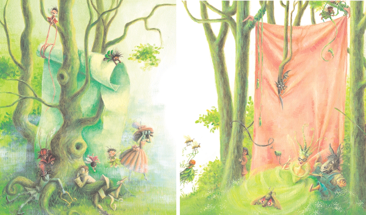 Wünschenswert allerdings wäre eine Unterteilung in Kapitel oder Szenen gewesen, da die Erzählung an sich sehr umfangreich ist. Das geheimnisvolle Treiben der Komödie wird von Almud Kunert in wunderschönen Illustrationen miteinander verwebt. Märchenhafte Elemente, charmante Waldgeister und bezaubernde Details schwirren über die Seiten. Leuchten den Weg durch die Geschichte und lassen der Fantasie viel Raum. Sommernachtstraumhaft schön…
