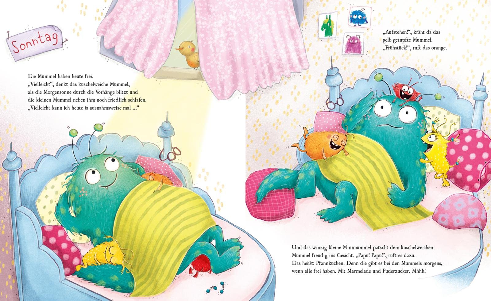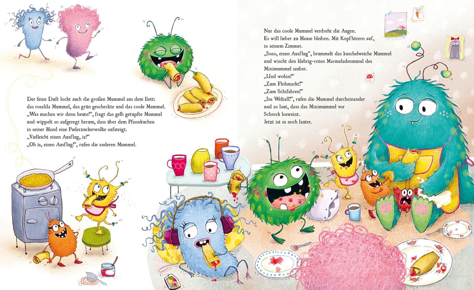 Sonntag; während die Strahlen der Morgensonne durch die Vorhänge blitzen, streckt sich das kuschelweiche Mummel im Bett. Plumps, hopsen das gelb getupfte, das orange Mummel sowie das Minimummel dazu. Auf geht es in die Küche, um Pfannkuchen zu machen. Die gibt es immer, wenn die Mummel frei haben. Der Duft lockt auch das rosalila, das grün gescheckte und das coole Mummel aus dem Bett. Als alle lecker Pfannkuchen mit Marmelade futtern, denken sie gemeinsam über einen Ausflug nach. Das Wetter ist perfekt für einen Tag im Hallenbad. Alle sind begeistert und sausen los, um ihre Sachen zusammenzusuchen.