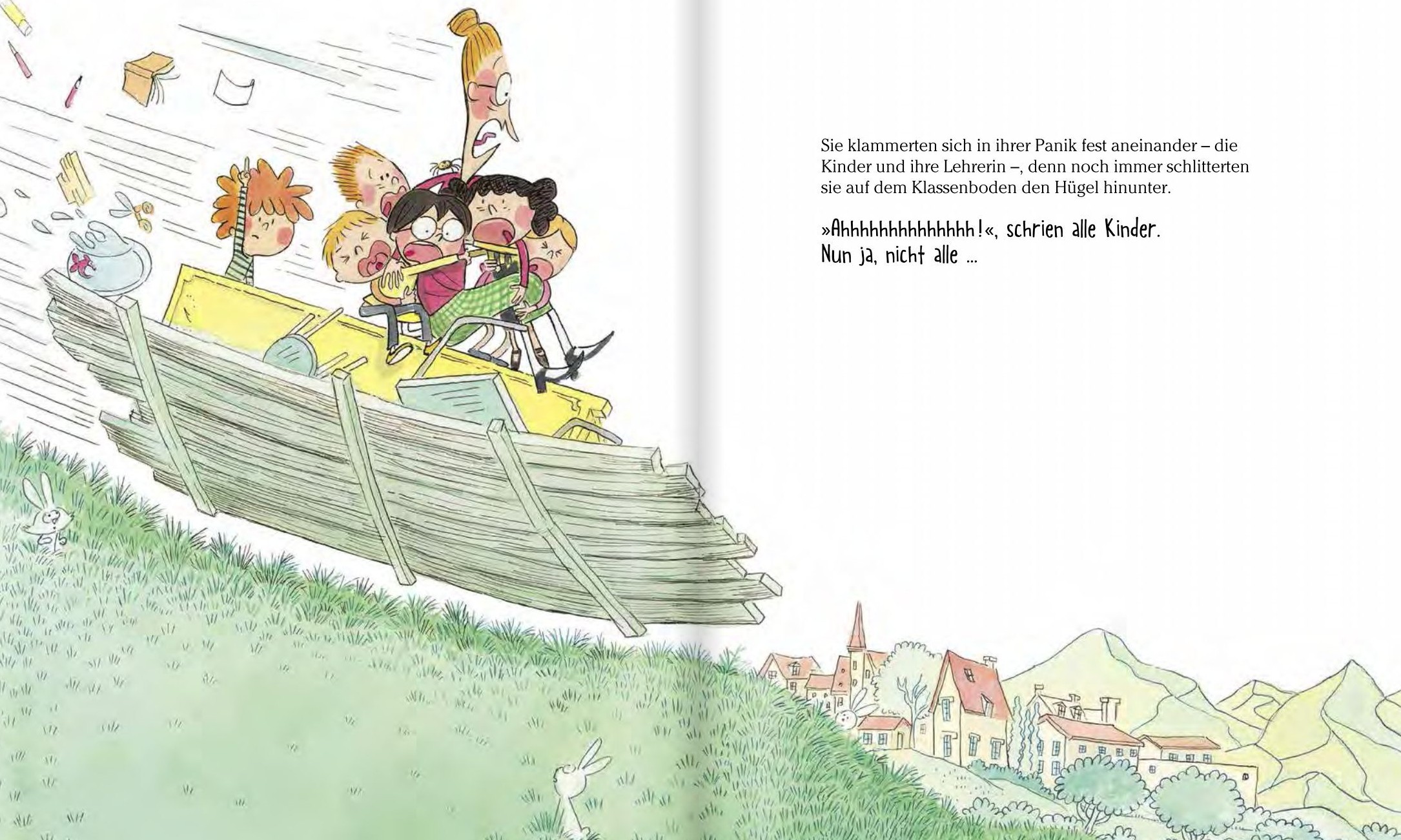 Der Aufprall ist so stark, dass das gesamte Klassenzimmer durch die Decke fliegt und im Schulhof landet. In diesem Moment setzt ein Sturm ein, der den Boden des Klassenzimmers über die Weide nahe der Schule über den Hügel bis hin zu einem Abhang weht. Platsch, macht das Floss, als es im Fluss landet. Der Boden wankt und schwankt. Alle versuchen sich festzuhalten. Vor allem, weil sie schon den gigantischen Wasserfall hören. Dem sie hoffnungslos ausgeliefert sind. Zum Glück wird der Strom danach ruhiger, und das Floss gleitet sanft dahin. Alle atmen erleichtert auf. Aber dann…