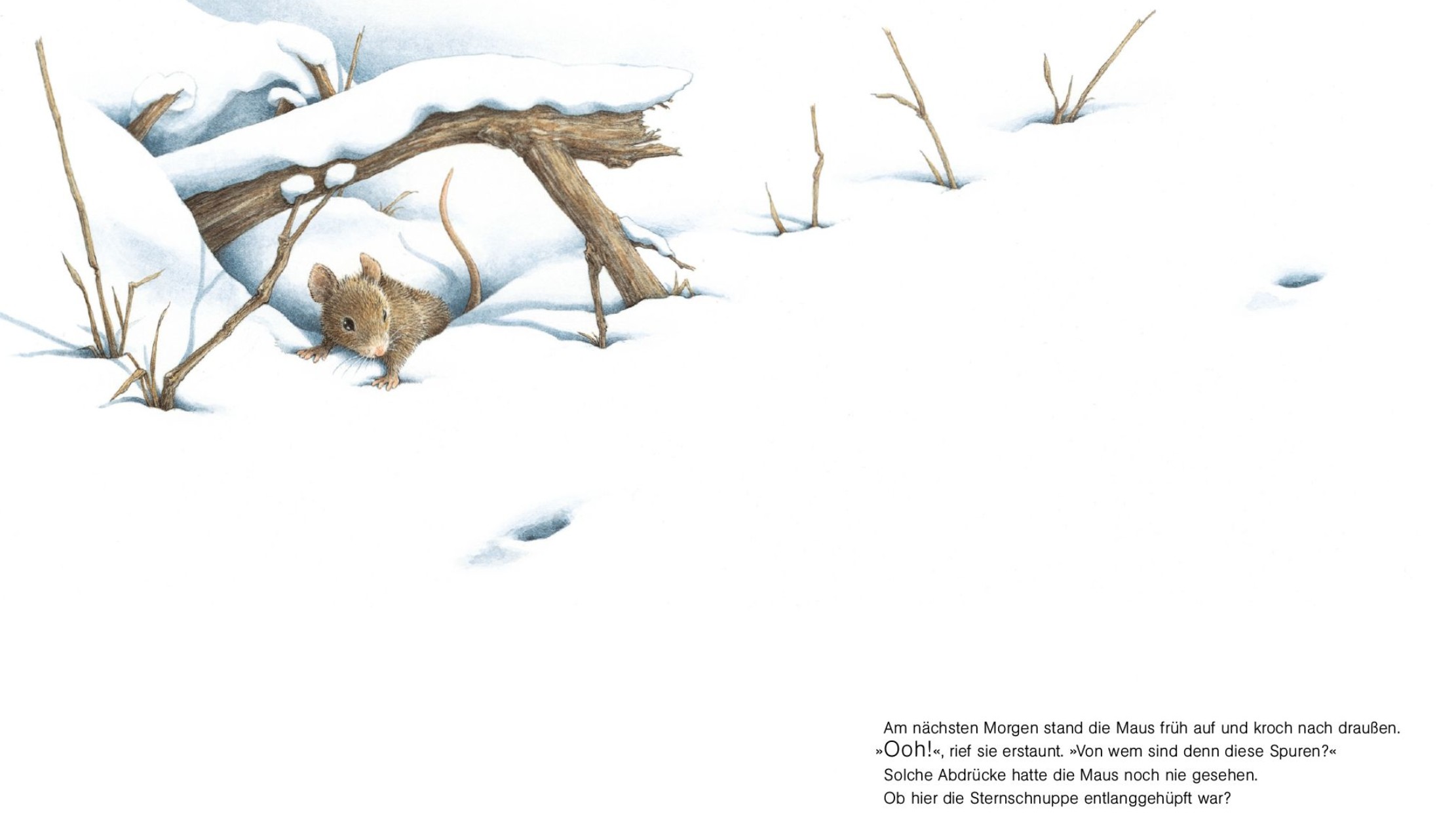 Sternschnuppen erfüllen Wünsche! Das weiß die kleine Maus von ihrem Freund, dem Maulwurf. Und als sie eine sieht, wünscht sie sich nichts sehnlicher, als wieder mit ihrem Freund zu spielen. Sie vermisst den Maulwurf sehr. Am nächsten Morgen entdeckt sie eine unbekannte Spur im Schnee. Ob die vom heruntergefallenen Stern stammt? Die kleine Maus macht sich in „Eine Sternschnuppe im Schnee“ auf die Suche. Vielleicht geht ihr Wunsch ja in Erfüllung?