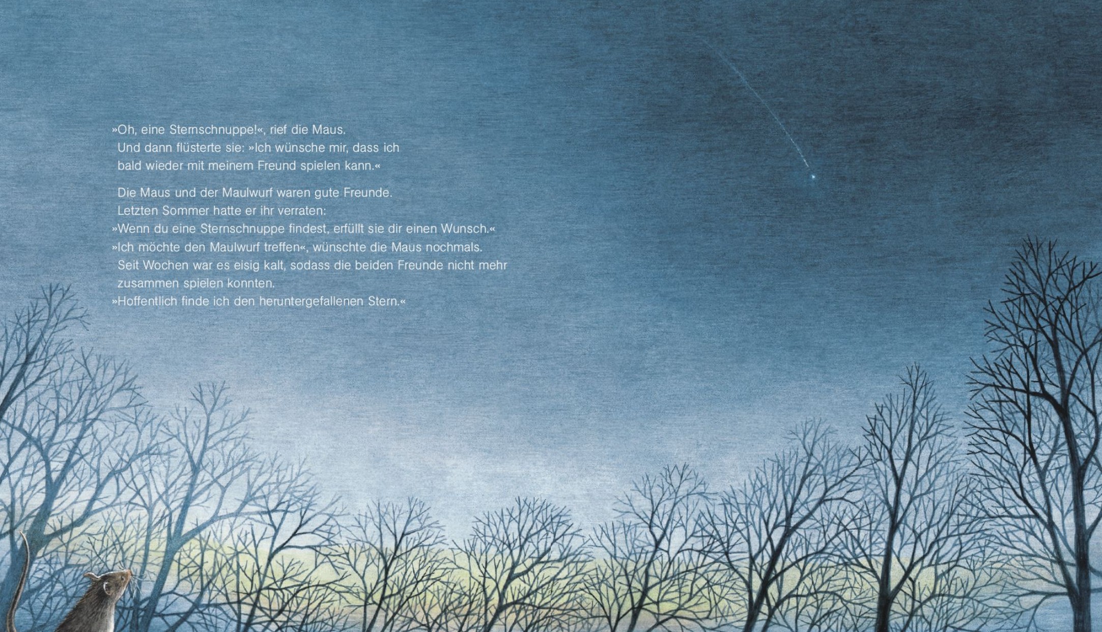 Am nächtlichen Abendhimmel saust eine Sternschnuppe durch die Dunkelheit. Die kleine Maus sieht sie und wünscht sich, dass sie wieder mit dem Maulwurf spielen kann. Die beiden sind gute Freunde und haben sich schon lange nicht mehr gesehen. Aber der Maulwurf hatte der kleinen Maus mal erzählt, dass wenn sie eine Sternschnuppe findet, diese ihr einen Wunsch erfüllt. Nun hofft sie, dass dieser auch in Erfüllung geht. Voller Hoffnung schlüpft sie wieder in ihr Loch und legt sich schlafen.