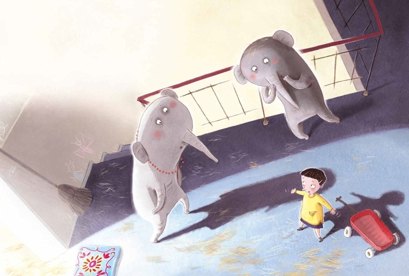 In der Nachbarswohnung sind neue Leute eingezogen. Fine kann sie hören. Es trampelt und raschelt. Hoffentlich haben sie Kinder, denkt sie. Im Haus wohnen bis jetzt leider nur schrecklich erwachsene Menschen. Das ist so langweilig. Vielleicht kann Fine es herausfinden. Im Treppenhaus ist mächtig was los. Frau Prull ist ganz blass um die Nase. Frau Wiese macht ein Gesicht, als hätte sie Zahnschmerzen und Herr Kösel grummelt: Es sind Elefanten, die neuen Nachbarn. Solche haben in dem Haus noch nie gewohnt. Die passen einfach nicht in die Nachbarschaft.