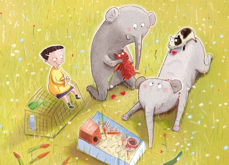 „Was müssen das für Räume sein, wo die großen Elefanten zur Miete wohnen, ohne sich zu stoßen. Rechts ein Zimmer, links ein Zimmer, und da drinnen rumpelt`s immer…“ – In Fines Haus ziehen neue Nachbarn ein: Elefanten! Fürchterlich finden die anderen Mieter. Ob die wirklich so sind? Fine beschließt in „Elefanten im Haus“, der Sache auf den Grund zu gehen…