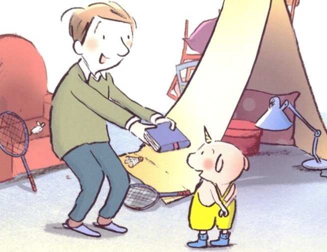 Emmi und Einschwein haben Ferien. Als sie gerade dabei sind eine Höhle zu bauen, kommt Emmis Papa ins Zimmer. Er hat den beiden eine Überraschung mitgebracht: Ein Buch aus der Bücherei. Einschwein ist verwundert. Es kann doch gar nicht lesen. Aber Papa hält das Buch hin und meint, dass er sich freuen würde, wenn Einschwein ein wenig in den Ferien übt. Einschwein mag aber lieber Ferien machen. Das findet Papa schade und sagt, dass Einschwein das Buch selbst in die Bibliothek zurückbringen soll.