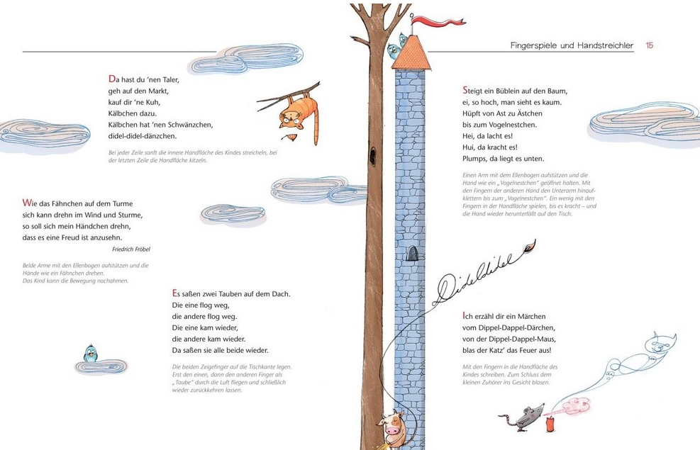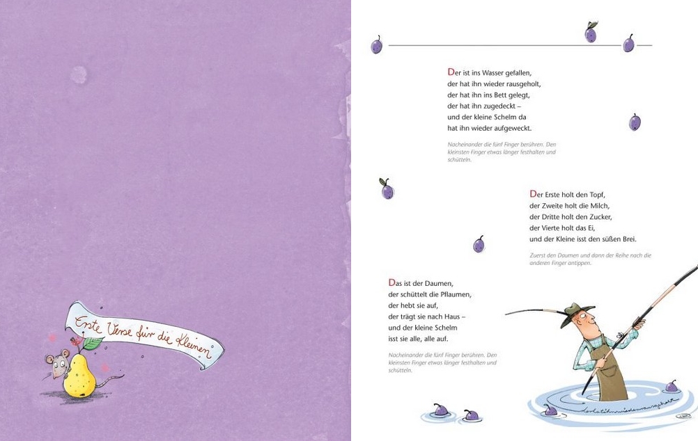 Alle meine Fingerlein sollen einmal Tiere sein. Eins, zwei, drei, vier, fünf Matrosen werden jetzt auf Reisen gehen; eins, zwei, drei, vier, fünf Matrosen wollen sich die Welt ansehen. Ri ra rutsch, wir fahren mit der Kutsch. Vor – zurück, vor – zurück. Hin und her, hin und her. Was wollen wir machen? Auf dem Kopf stehen und lachen: „Ene mene mink mank pink pank: Das Hausbuch der Kinderreime und Gedichte“…