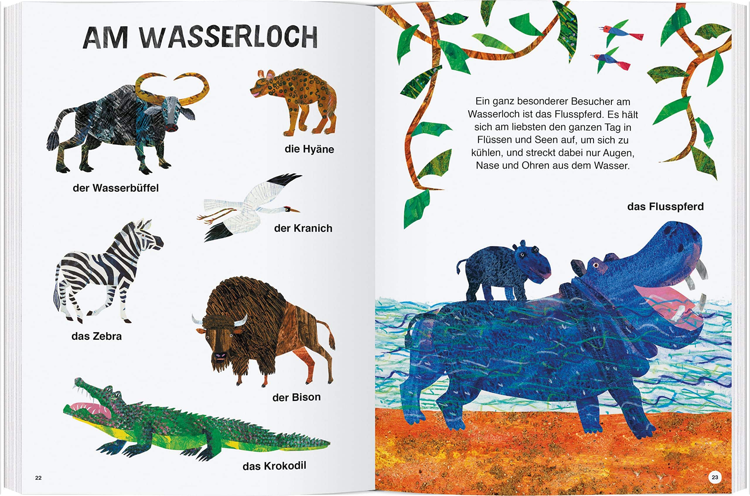 Hier treffen Wasserbüffel, Hyäne, Zebra, Bison und Krokodil zusammen. Ein ganz besonderer Besucher ist das Flusspferd. Es hält sich am liebsten den ganzen Tag über in Flüssen und Seen auf, um sich zu kühlen. Das größte Landtier der Welt, der Elefant, hat ein sanftes Gemüt. Sein biegsamer Rüssel ist sehr nützlich. Mit ihm saugt der Elefant Wasser aus Wasserlöchern und führt die Nahrung zum Maul. Und er kann damit riechen sowie mit seinen Artgenossen kommunizieren.