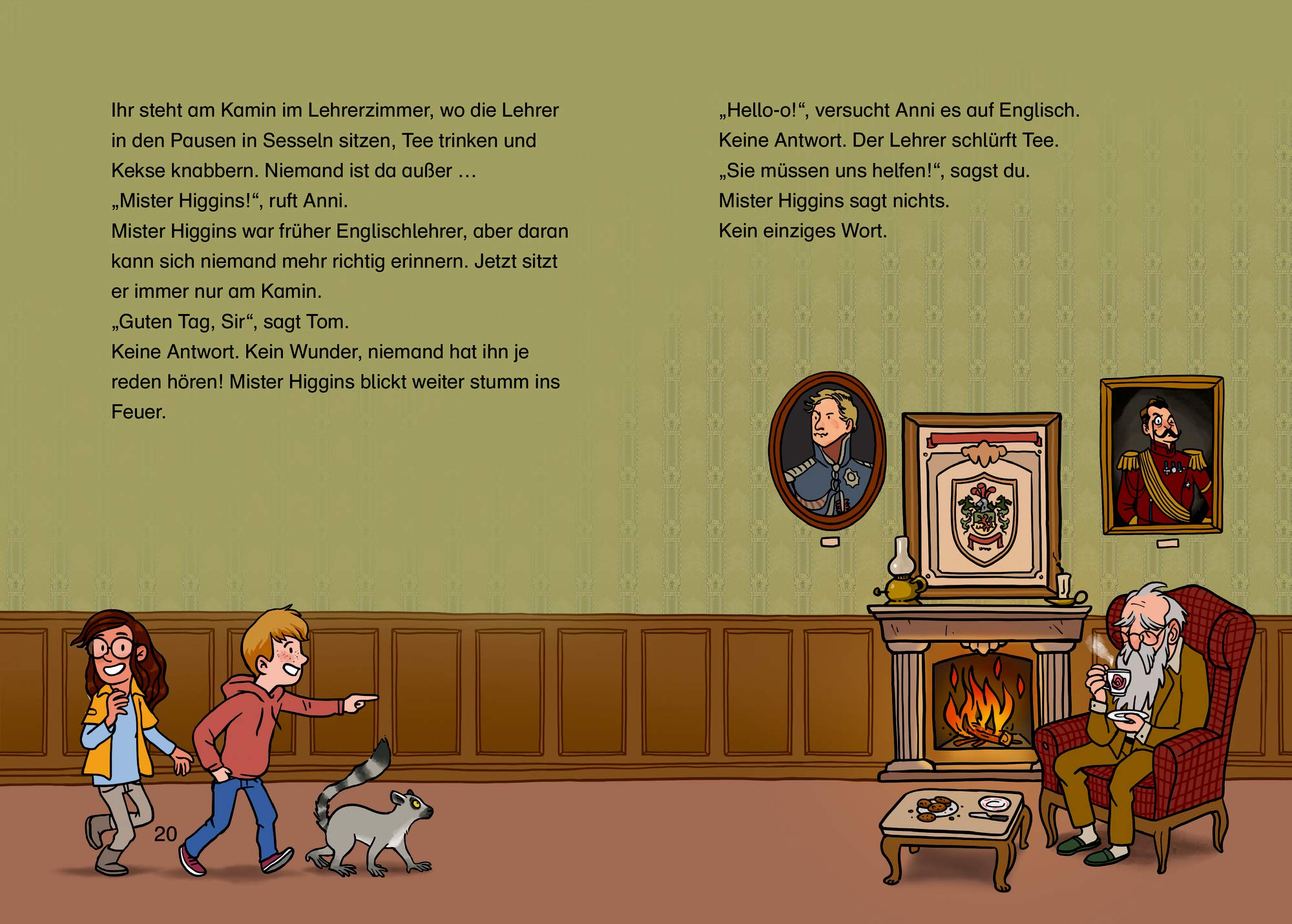 Die Drei brauchen Hilfe und eilen zum Lehrerzimmer. Aber nur Mister Higgings, der frühere Englischlehrer, ist vor Ort. Stumm trinkt er seinen Tee und starrt ins Kaminfeuer. Als das Dunkle Buch erwähnt wird, sieht Mister Higgings plötzlich mit leuchtenden Augen auf. Nuschelnd erzählt er von einem zweiten Zauberbuch, dem Buch der sieben Zauber. Es bewacht das Internat seit ewigen Zeiten. Nur dieses Buch vermag die Schule zu retten. Das Buch der sieben Zauber ist vor den Kobolden geflohen und hat sich versteckt. Doch hat es eine Spur hinterlassen…