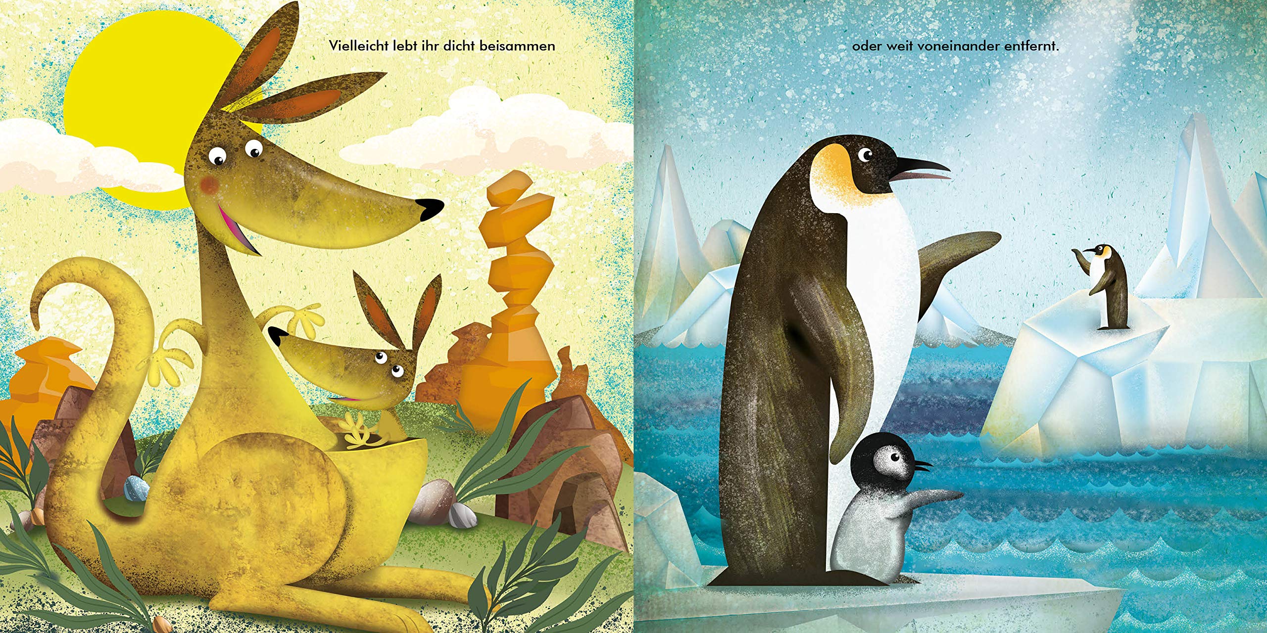Familie: Das alles sind wir - Kängeru mit Nachwuchs im Beutel und Pinguin mit Nachwuchs