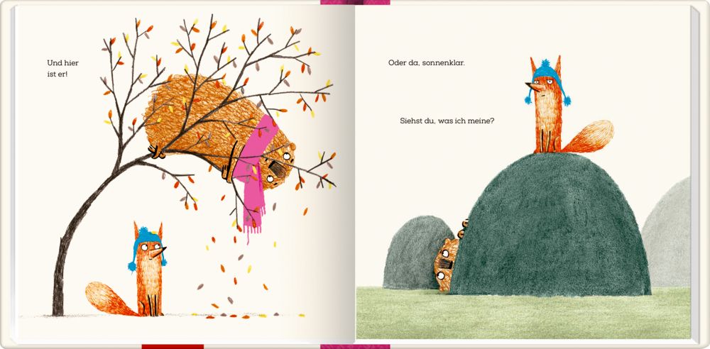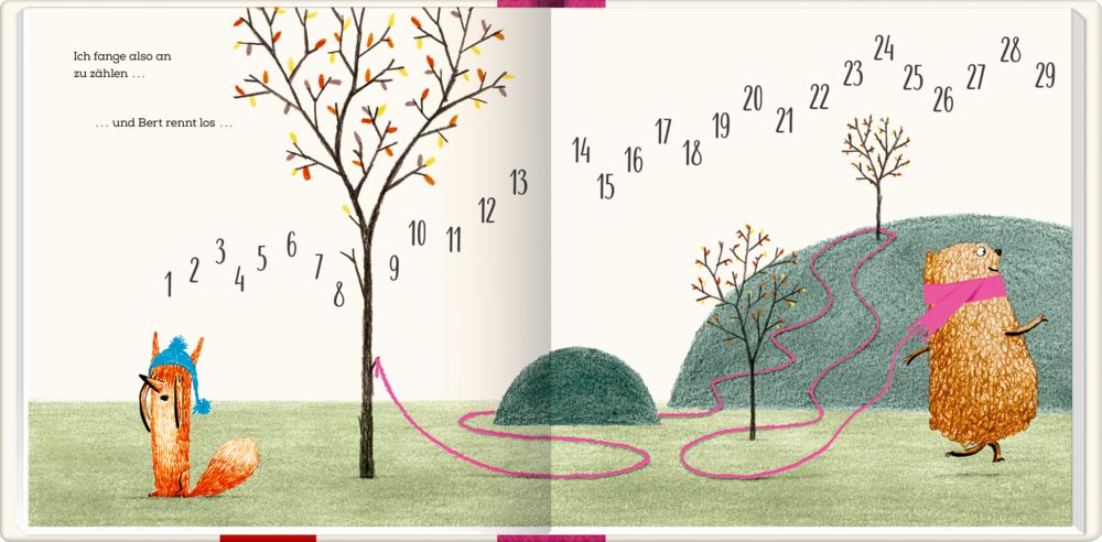 Fuchs gewinnt auch gern. Aber er gibt seinem besten Freund die Chance und zählt statt bis zur 10 bis 100. Was wirklich und echt viel Zeit ist. Also schließt Fuchs die Augen und fängt an zu zählen. 1, 2, 3, 4, 5, 6, 7, 8, 9, 10… und Bert rennt los. Nur leider verfängt sich ein Faden aus seinem Schal am Ast eines Baumes und hinterlässt eine Spur…