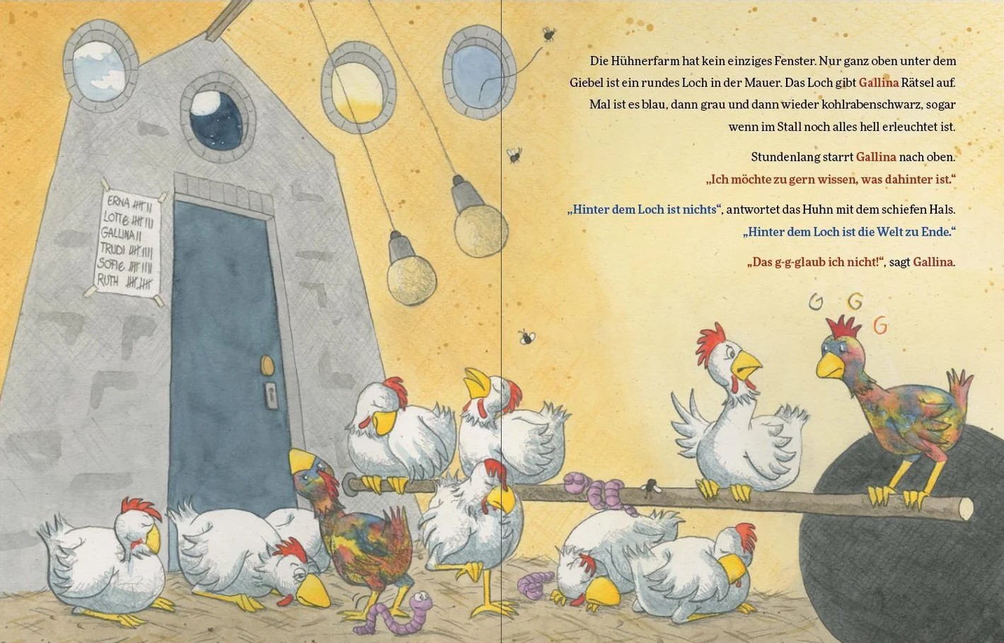 Im Stall von Bauer Reineke leben vierhundertneunundneunzig weiße und ein buntes Huhn: Das ist Gallina. Jeden Tag Eierlegen. Jeder Tag ist gleich. Ist das wirklich alles? Das kann Gallina nicht glauben. Besonders das Loch oben in der Mauer der Hühnerfarm gibt Gallina Rätsel auf. Stundenlang starrt sie nach oben und denkt nach. Darüber vergisst sie sogar das Eierlegen. Und macht eines Tages eine Entdeckung. Hinter dem Loch fliegt etwas.