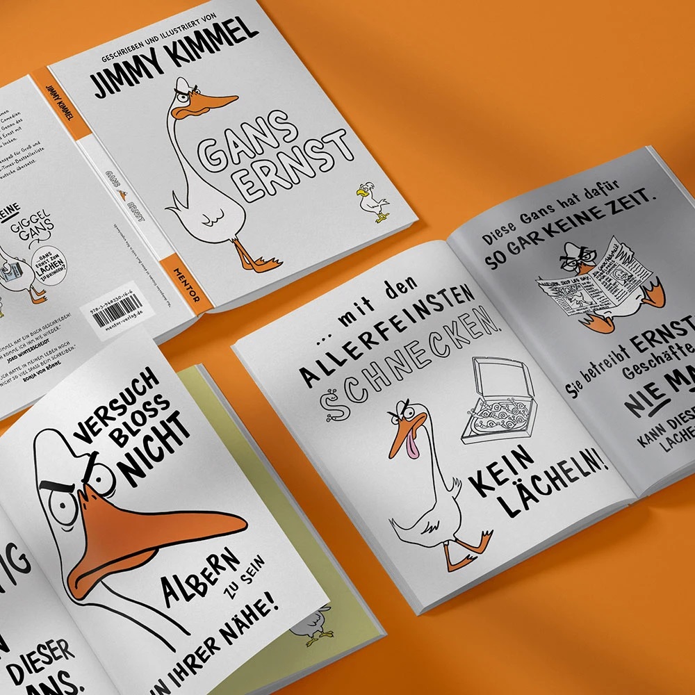 Rumalbern, Grimassen schneiden und Spaß haben: Hinter Jimmy Kimmels „Gans Ernst“* verbirgt sich ein einfaches Konzept. Gestalterisch reduziert auf das Zusammenspiel von Text und Typografie sowie Gestik und Mimik der mürrischen Gans. Farblich hauptsächlich in Weiß, Schwarz und Orange gehalten. Zusätzlich sind eine kleine, festere Spiegelfolie sowie ein weiterführender Download-Link für ein Malbuch enthalten.