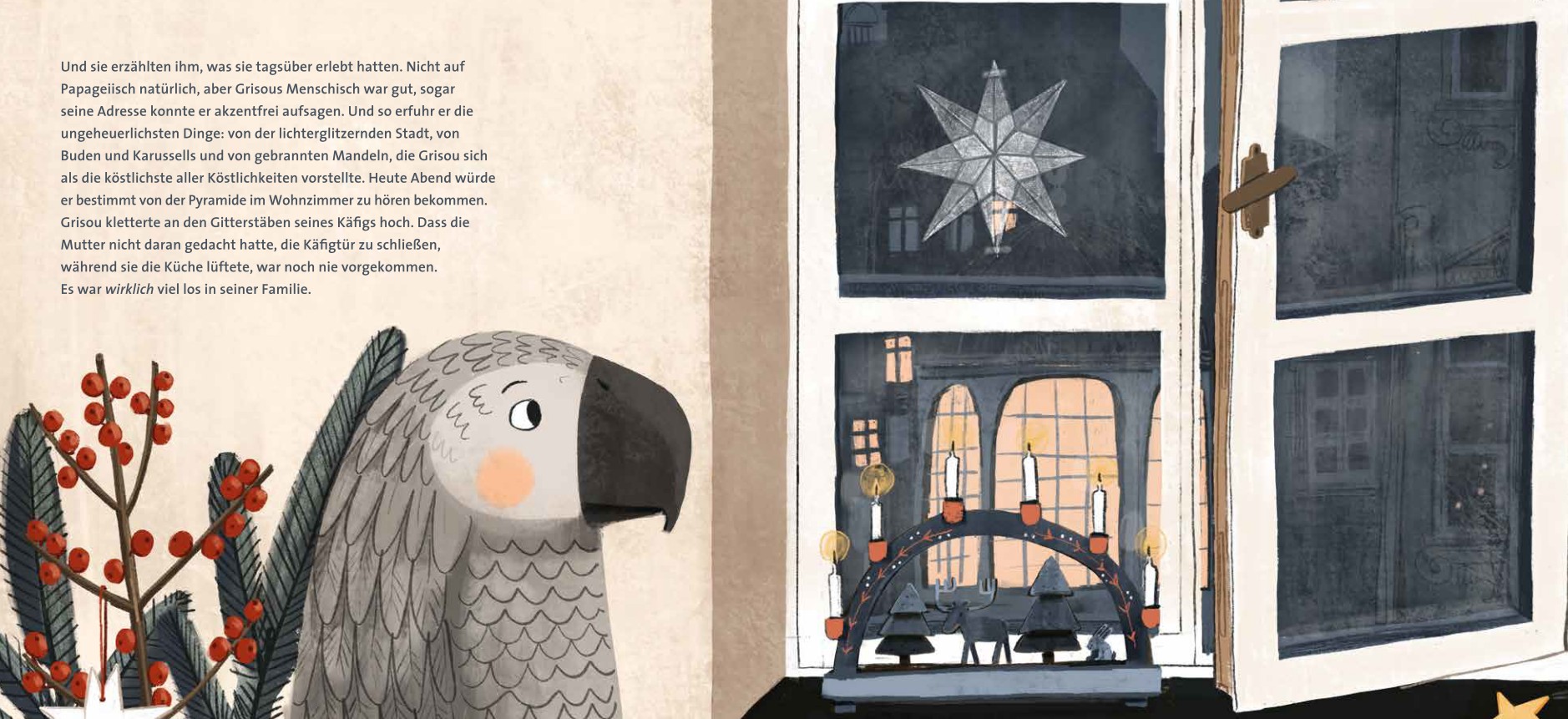 Eine lichterglitzernde Stadt, Karussells und Buden. Wie gern würde Graupapagei Grisou das alles einmal sehen. Aber vor allem träumt er von der köstlichsten aller Köstlichkeiten – gebrannte Mandeln. Die soll es auf dem Weihnachtsmarkt geben. Und kurz vor Weihnachten ist seine Chance gekommen. Durch das offene Küchenfenster macht er sich auf zu einem Ausflug durch die weihnachtliche Stadt: „Gebrannte Mandeln für Grisou“…