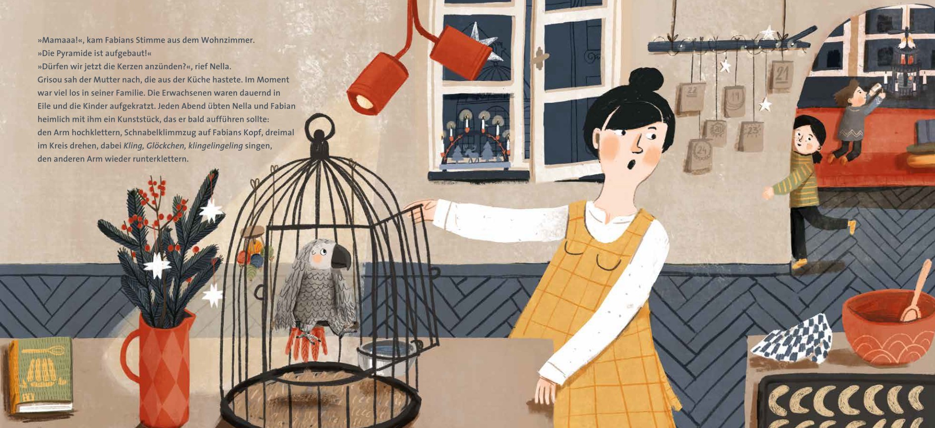 In Grisous Familie war in der Adventszeit viel los. Jeden Abend erzählten ihm Nella und Fabian von den Lichtern in der Stadt, von Buden und Karussells, von der Pyramide mit den Kerzen im Wohnzimmer und von gebrannten Mandeln, die Grisuou sich als die köstlichste aller Köstlichkeiten vorstellte. Gerade als er an den Gitterstäben seines Käfigs hochkletterte, bemerkte er, dass die Käfigtür offenstand.