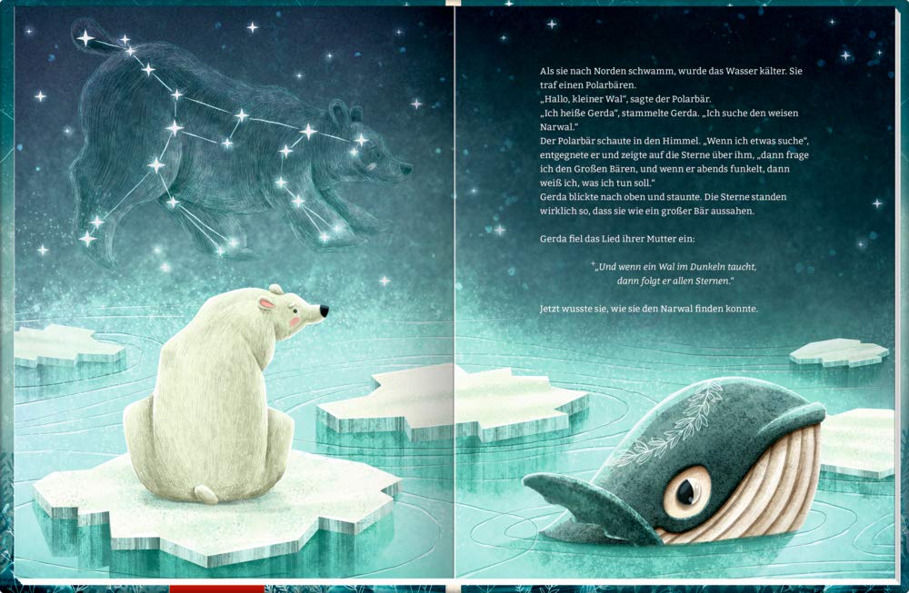 Und eines Tages ist es so weit. Gerda lässt sich von der Meeresströmung tragen. Auf ihrer Reise begegnen ihr Pinguine, Tintenfische, Möwen und Eisbären. Doch einen Platz für Gerda findet sich nicht. Trost auf ihrer Suche spendet ihr das Lied der Mutter. Entschlossen sucht Gerda weiter. Bis ihr die Orcas den Tipp geben, den weisen Narwal des Nordens zu fragen. Ob er ihr helfen kann, den Ort zu finden, wo sie glücklich sein kann?
