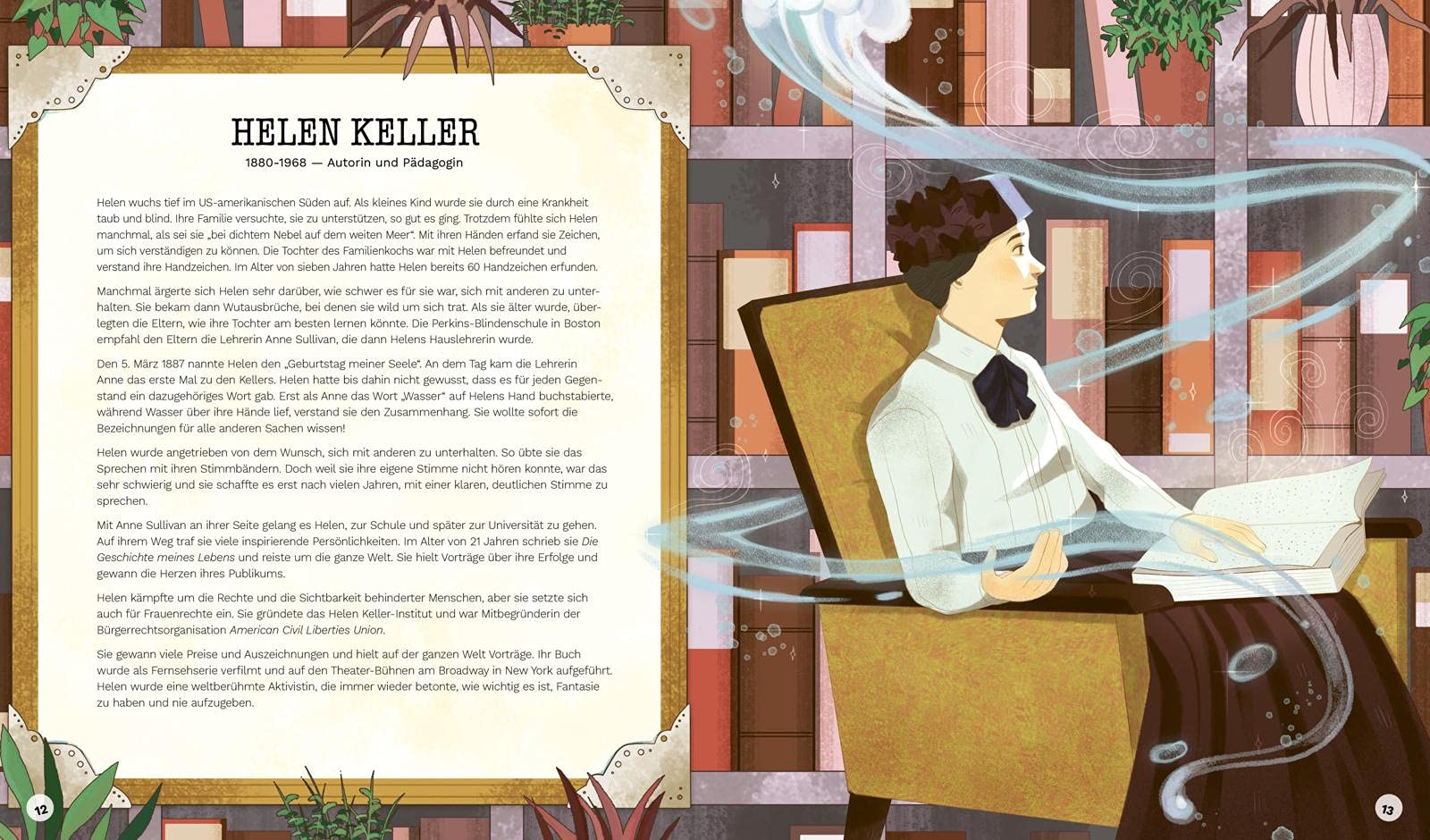 Die US-Amerikanerin Helen Keller wurde durch eine Krankheit als kleines Kind taub und blind. Ihre Familie versuchte, sie zu unterstützen, so gut es ging. Trotzdem war es schwer für sie. Über eine Empfehlung engagierten sie die Lehrerin Anne Sullivan, die Helens Hauslehrerin wurde. Mit Anne Sullivan an ihrer Seite gelang es Helen, zur Schule und später zur Universität zu gehen. Im Alter von 21 Jahren schrieb sie „Die Geschichte meines Lebens“ und reiste um die ganze Welt. Helen kämpfte um die Rechte und die Sichtbarkeit behinderter Menschen und setzte sich auch für Frauenrechte ein. Sie gründete das Helen-Keller-Institut und war die Mitbegründerin der Bürgerrechtsorganisation „American Civil Liberties Union“.