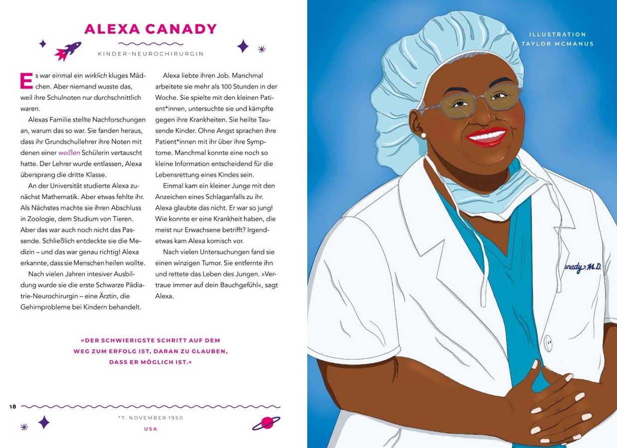 Es war einmal ein wirklich kluges Mädchen, dessen Schulnoten nur durchschnittlich waren. Warum, das fand ihre Familie aufgrund von Nachforschungen heraus. Ein Grundschullehrer hatte ihre Noten mit denen einer weißen Schülerin vertauscht. Der Lehrer wurde entlassen und Alexa übersprang die dritte Klasse. An der Universität studierte Alexa zunächst Mathematik, danach machte sie ihren Abschluss in Zoologie. Doch irgendwie fehlt ihr etwas. Schließlich entdeckte sie die Medizin. Alexa wollte Menschen heilen. Nach vielen Jahre intensiver Ausbildung wurde sie die erste Schwarze Pädiatrie-Neurochirurgin – eine Ärztin, die Gehirnprobleme bei Kindern behandelt.
