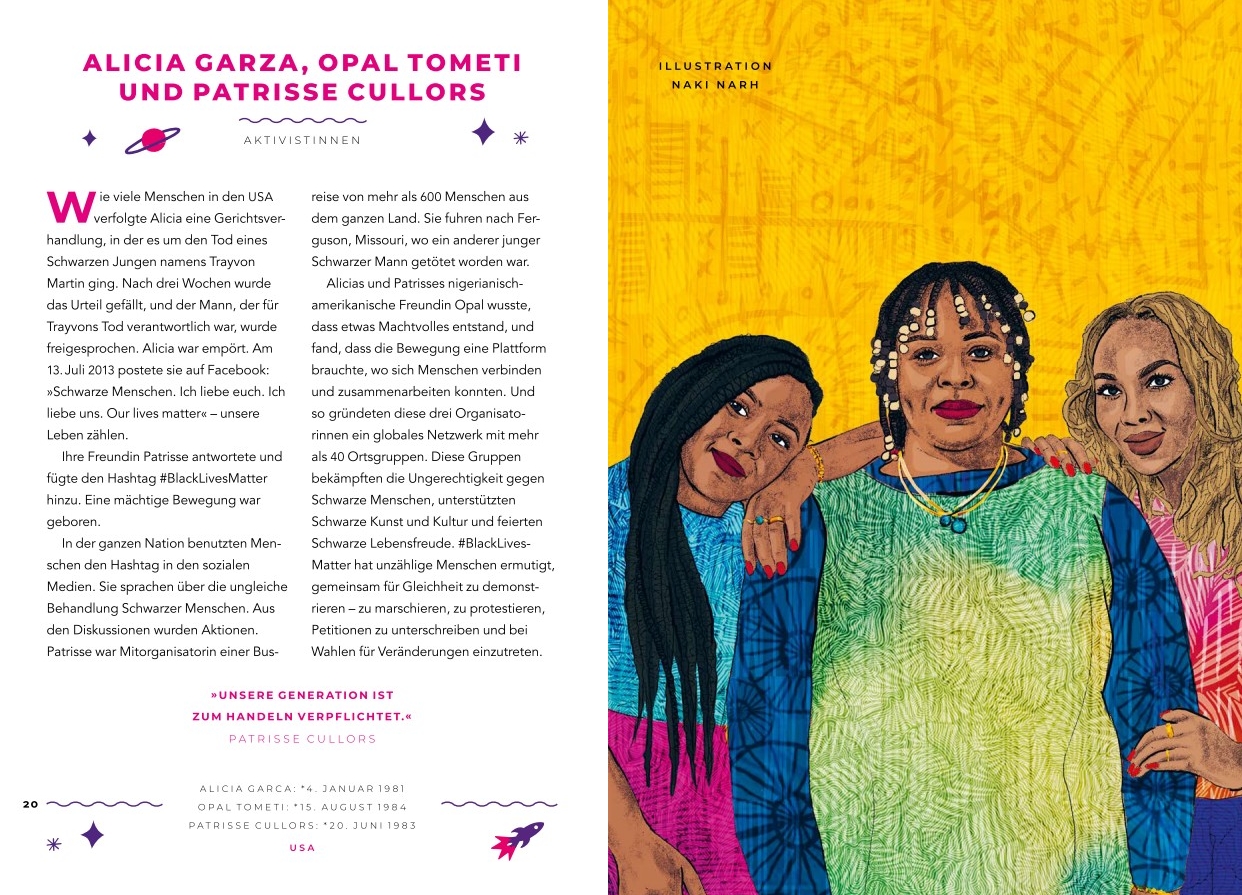 In alphabetischer Reihenfolge werden Frauen auf je einer Doppelseite mit einer ganzseitigen Kurz-Biografie und einem illustratorischen Portrait vorgestellt. Jede Biografie beschreibt die Kindheit, das Erwachsenwerden sowie die Errungenschaften und Visionen. Am Ende des Buches gliedern sich ein Glossar an, ein Abschnitt für die eigene Lebensgeschichte sowie eine Auflistung von Schwarzen Frauen, die in anderen Büchern der „Rebel-Girls-Serie“ vorgestellt werden. Eine informative, kraftvolle und motivierende Lektüre voller Positivität für alle. Vor allem aber eine großartige Möglichkeit sich inspirieren zu lassen.