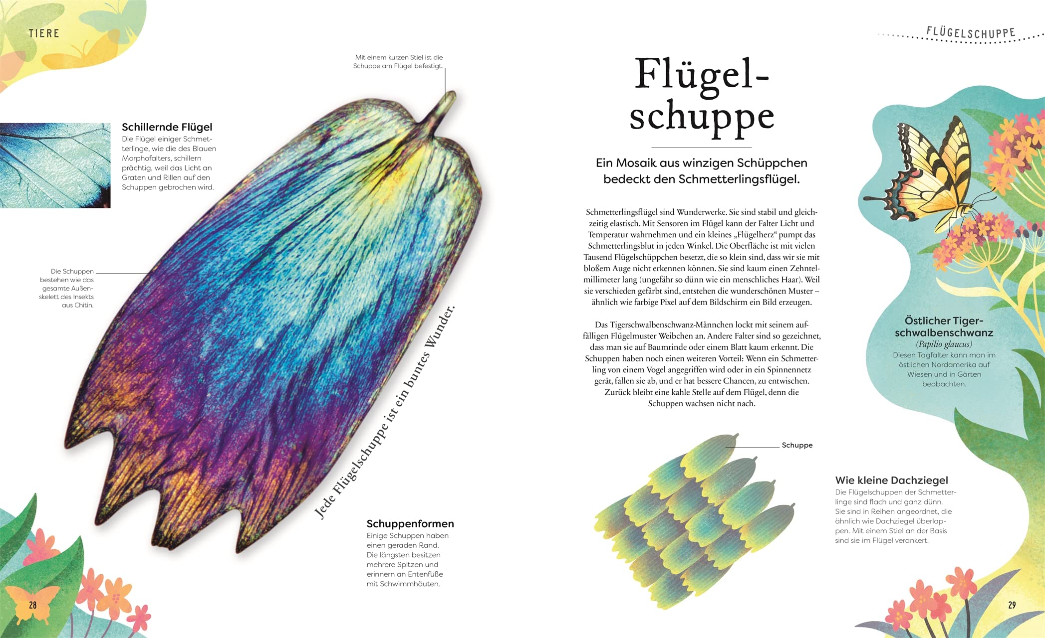 Schmetterlingsflügel sind Wunderwerke. Die Oberfläche ist mit vielen Tausend Flügelschüppchen besetzt, die so klein sind, dass sie mit dem bloßen Augen nicht zu erkennen sind. Diese sind kaum ein Zehntelmillimeter lang – ungefähr so dünn wie ein menschliches Haar. Weil sie so verschieden gefärbt sind, entstehen die wunderschönen Muster, ähnlich einem Mosaik.