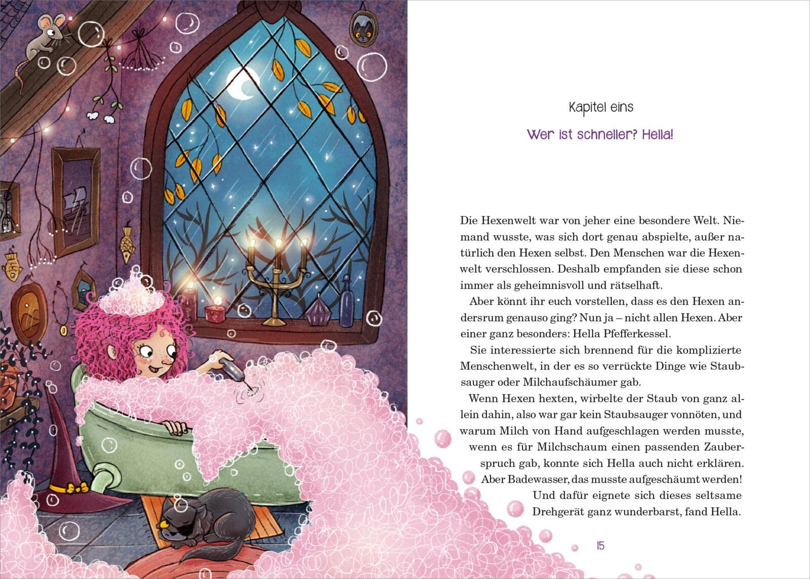 Ihre magischen Freunde sind gar nicht begeistert von der Idee. Vor allem, wie will sie dem Hexenrat erklären, dass sie nicht an der alljährlichen großen Hexenversammlung in der Nacht teilnimmt. Aber Hella ist Feuer und Flamme. Echte Menschen treffen und endlich die Welt kennenlernen, in der sie leben. Der wichtigen Hexenversammlung einfach so fernzubleiben, kommt natürlich nicht in Frage. So nimmt Hella ihren ganzen Hexenmut zusammen und erzählt auf der Versammlung von ihrem Plan. Während die anderen Hexen in Gelächter ausbrechen und sich wieder ihren Gesprächen zuwenden, macht sich Hella unbemerkt auf den Weg in die Menschenwelt…
