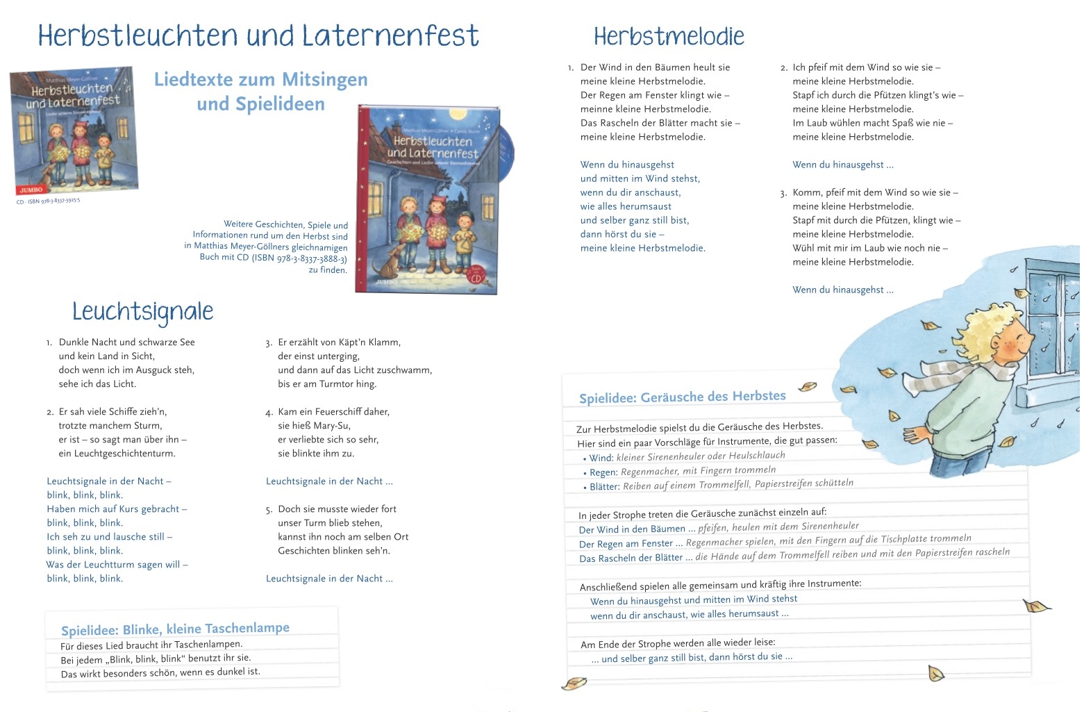 Laubrascheln, Kürbissuppe, Drachen steigen lassen oder Laternenumzüge machen den Herbst zu einer ganz besonderen Jahreszeit. Mit seinen in seinen Geschichten, Liedern und Gedichten in „Herbstleuchten und Laternenfest: Geschichten und Lieder unterm Sternenhimmel“* erzählt Matthias Meyer-Göllner von Blättern, Sternen, Geräuschen, Sankt Martin sowie Laternen und bringt die kunterbunte Herbstzeit anschaulich näher. Dazu gibt es Spiel- und Bastelideen, Rezepte und wundervolle Illustrationen aus der Feder von Carola Sturm, die den Zauber des Herbstes farbenfroh einfangen. Mit der beiliegenden CD bietet das Buch rundum unterhaltsame Mischung zum Mitsingen, Tanzen, Mitmachen, Zuhören und Erleben.
