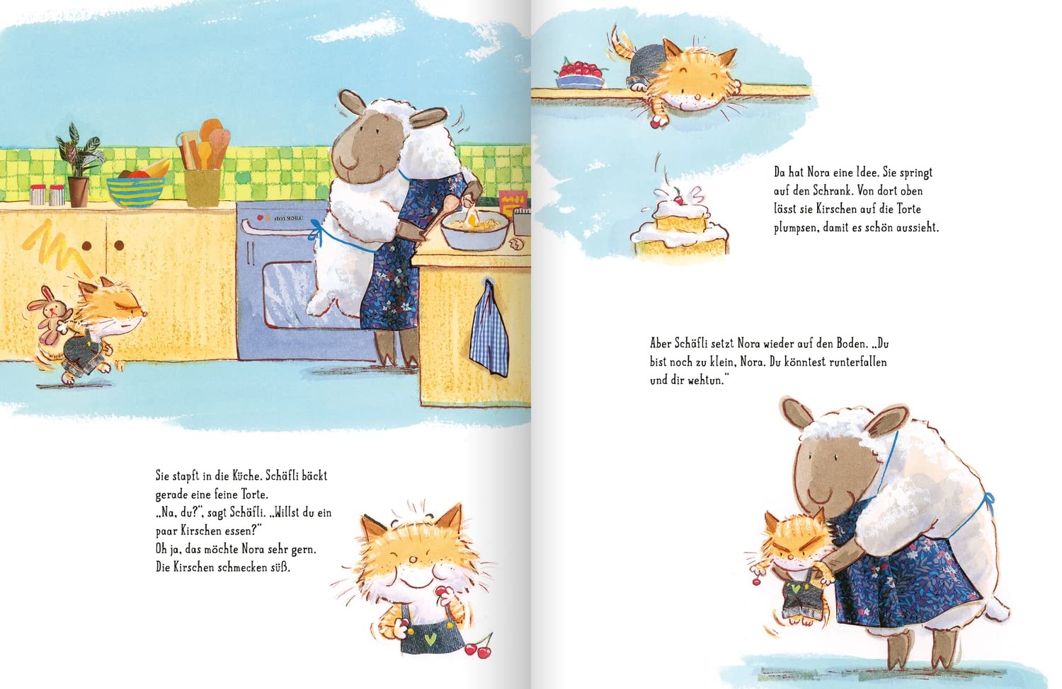 Jetzt ist sie wütend. Sogar schon zweimal. Grummelnd stapft sie in die Küche. Schäfli bäckt gerade eine Torte. Aber Noras Idee auf den Schrank zu hüpfen und von dort eine Kirsche auf die Torte plumpsen zu lassen, findet sie gar nicht gut. Nora bekommt neue Wut. Und wenn man zum dritten Mal am Tag Wut bekommt – ja, dann ist die Wut ordentlich stark. Ihre Wut ist jetzt überall. Im Kopf, im Bauch, in den Händen und in den Füßen. Und weil sie stark ist, muss sie einfach raus…