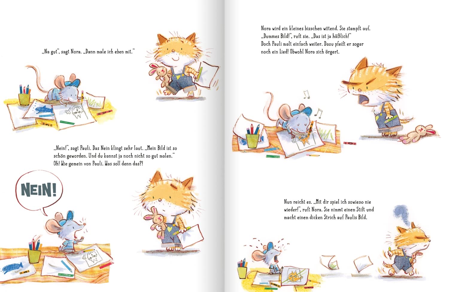 Die Sonne scheint. Es ist ein richtig schöner Tag. Nora mag mit Pauli im Garten spielen. Das wird lustig. Doch Pauli hat keine Lust, der malt lieber an seinem Bild weiter. Dann malt Nora eben mit. Aber das möchte Pauli nicht. Was soll denn das? Nora wird ein kleines bisschen wütend. Sie geht zu Eddi in die Werkstatt. Der ist vertieft in die Reparatur des Gartentisches. Zum Spielen hat er keine Zeit. Ein wenig mehr Wut kommt noch zur Wut hinzu, die sie schon wegen Pauli hat.
